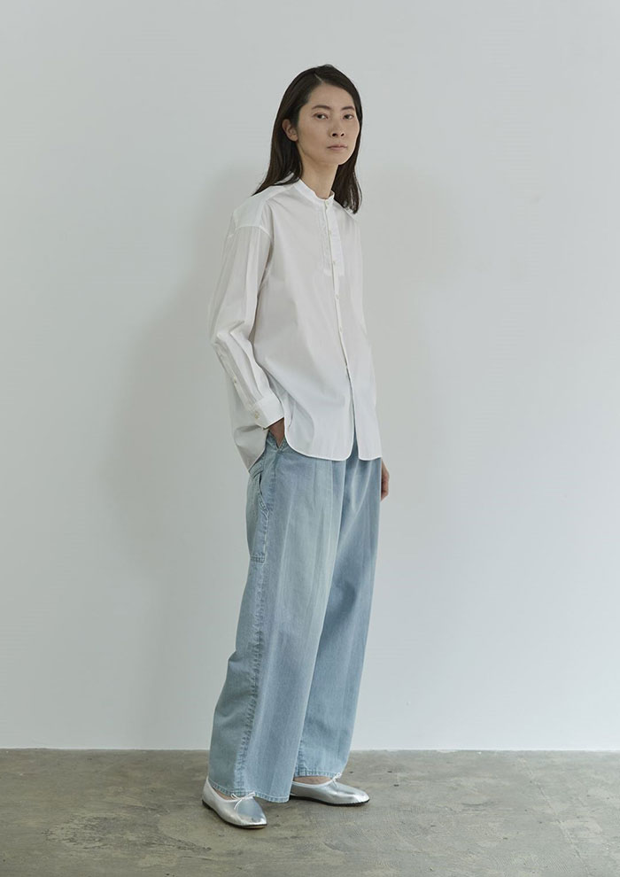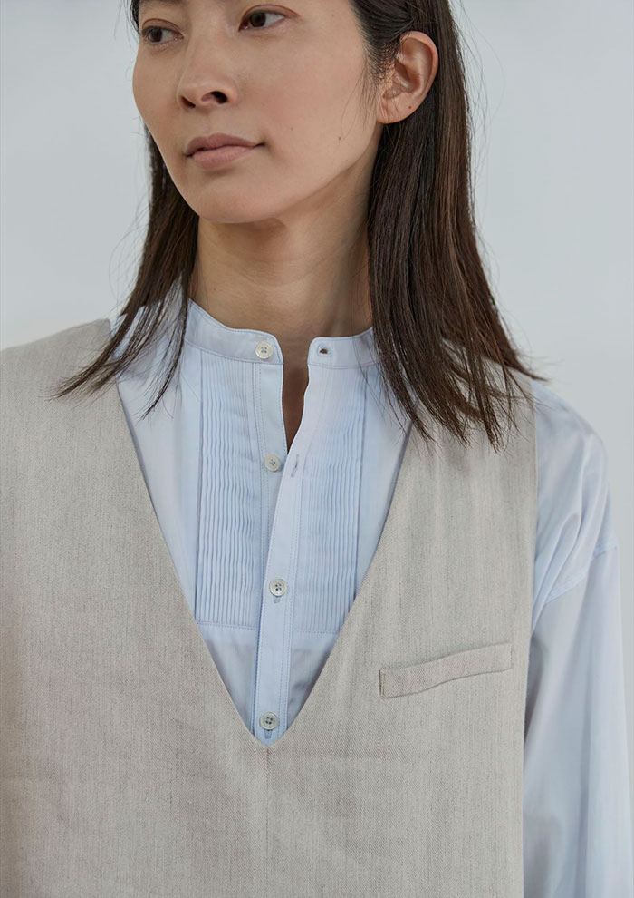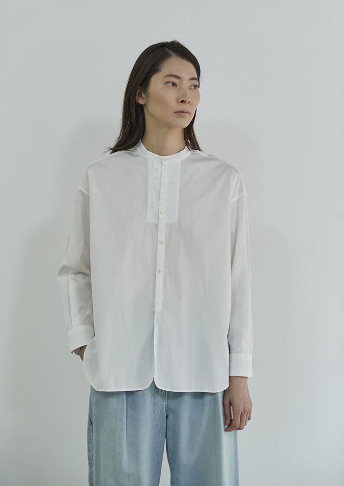 「こちらは「ティッカ」で定番のノーカラーシャツに繊細なピンタックを施した一枚。バランスの良い着丈に仕上げることで、パンツ、スカートとも合わせやすく、シンプルなコーディネートにするとより素材の上質感が引き立ちます」。