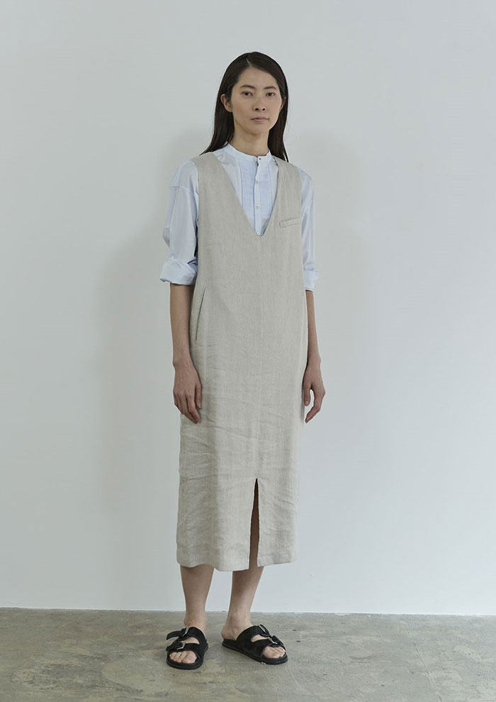 「美しい表情と上品な存在感が印象的なピンタックノーカラーシャツに、ミニマルでマニッシュなリネンのジャンパースカートを合わせ、すっきりとした大人の洗練スタイルに。タイトになりすぎずほどよくゆとりを保ったジャンパースカートは、柔らかさと軽さに加えストレッチ性があるので着心地も抜群です。きれい目にもカジュアルにも着やすくさまざまなシーンで活躍。「ティッカ」のシャツやカットソーとも相性抜群です」。