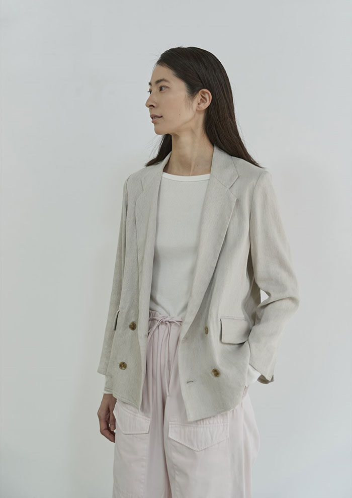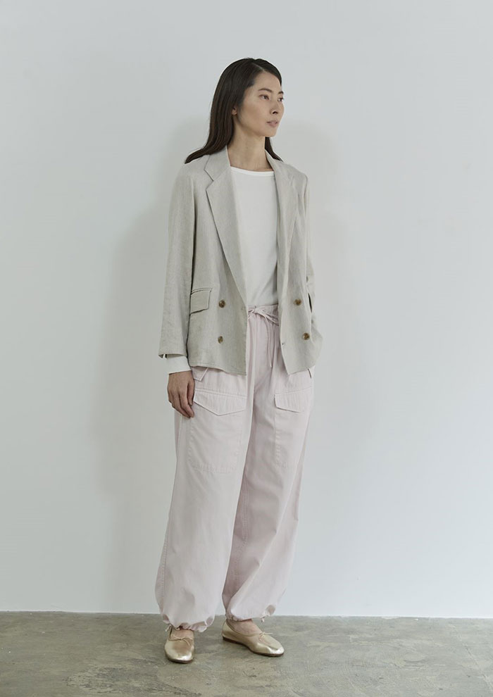 「ドライな風合いと辛口なワークディテールのバランスが絶妙なカーゴパンツは、普段パステルカラーを着ない人も挑戦しやすい一本。それに、リネンのゆるやかで抜け感のあるリラクシーなジャケットを合わせるとさらに明るく洗練された着こなしに仕上がります。中に着たカットソーは、襟ぐりが美しいボートネックのロングTシャツ。色違いでそろえたくなるほど便利なアイテムです。ジャケットは前出のジャンパースカートとのセットアップもおすすめ」。