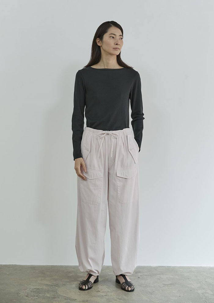 「前出と色違いのボートネックのロングTシャツにパステルカラーのカーゴパンツを合わせたルック。Tシャツはコンパクトながらほどよく肌離れする絶妙なサイズ感と着心地が魅力。甘くなりがちなパステルカラーも、カーゴパンツだとシックな大人顔に仕上がります。ルーズすぎない誰にでも似合うシルエットは、コーディネートを考える時間まで楽しくなりそう」。