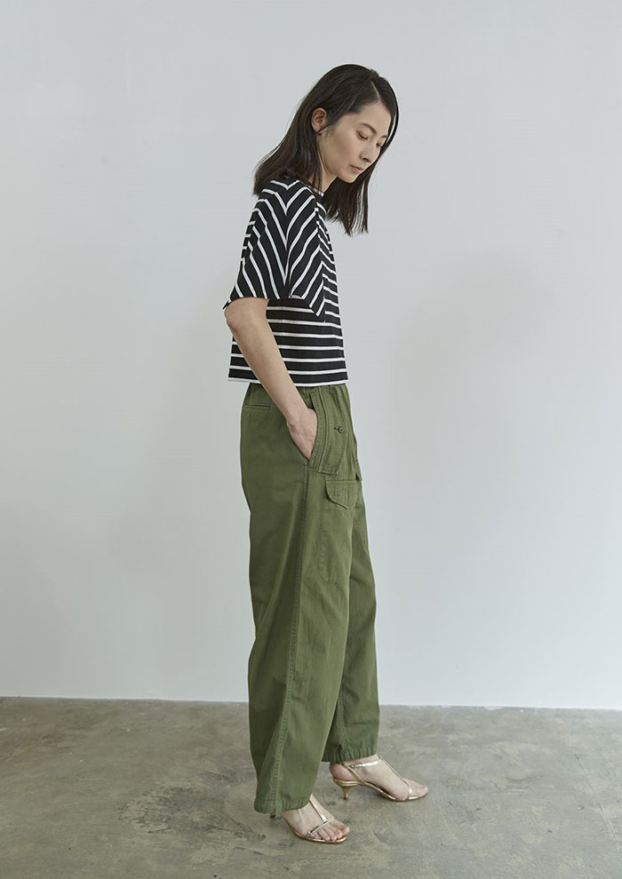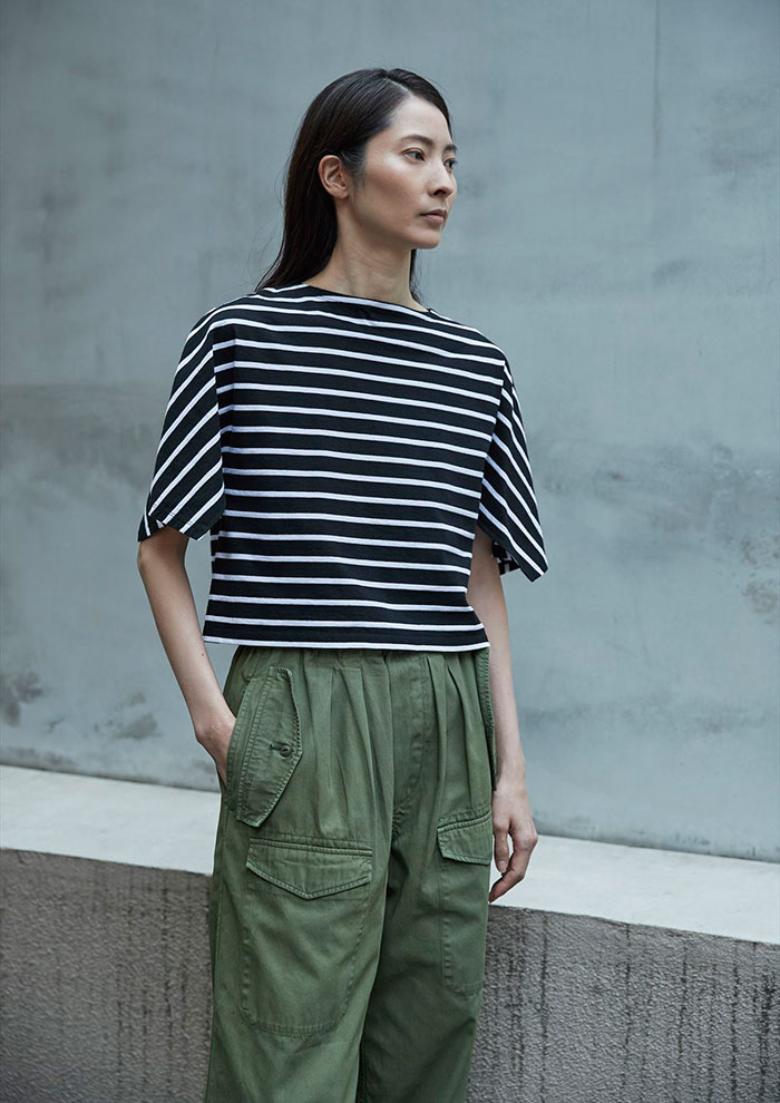 「こちらは、開いた袖下がデザインポイントのフレンチシックなボーダーT。コンパクトな着丈と身頃のサイズ感のバランスが秀逸で、どんなボトムとも好相性です。デコルテをきれいに見せてくれるボートネックが印象的。清涼感があり肌離れも良いため、暑い季節にも大活躍します。カーゴパンツにヒールサンダルを合わせて、女性らしい上品カジュアルを楽しんで」。