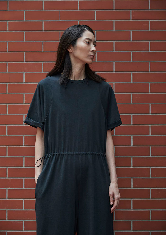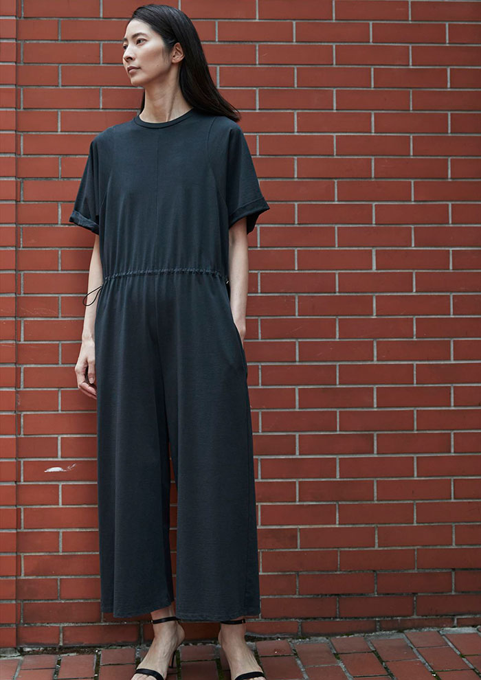 「すっきりと削ぎ落としたデザインがモード感漂うカットソーのコンビネゾン。ウエストにスピンドルディテールを加えているため、ギャザーを寄せたり、ギャザーを寄せずにすとんと着たりと、一枚でまったく違った表情とシルエットが楽しめます。見た目は布帛のようですが、一度袖を通せばカットソーの極上の肌触りとドレープ感に驚いていただけるはず」。
