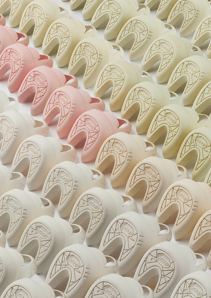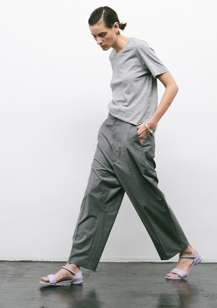 「“PADDED SANDAL”という名前の通り、フカフカとしたアッパーが足を包み込む一足。広めのスクエアトゥなのでどんな足の形にも合いやすく、適度なボリューム感がスタイリングのバランスを整えます。アンクルストラップはマジックテープで調整するタイプ。着脱も楽な上、足にフィットしやすく、たくさん歩く日にも疲れにくいです。なかでも、ブラックはぜひ一足目にお持ちいただきたいカラー。ノールックで出かけられるほど便利です。今年の新色は、肌を美しく見せるヘルシーなベージュと、グレーのスタイリングやデニムなどと合わせやすいラベンダー。どちらも日本人の肌にマッチする色味です」。