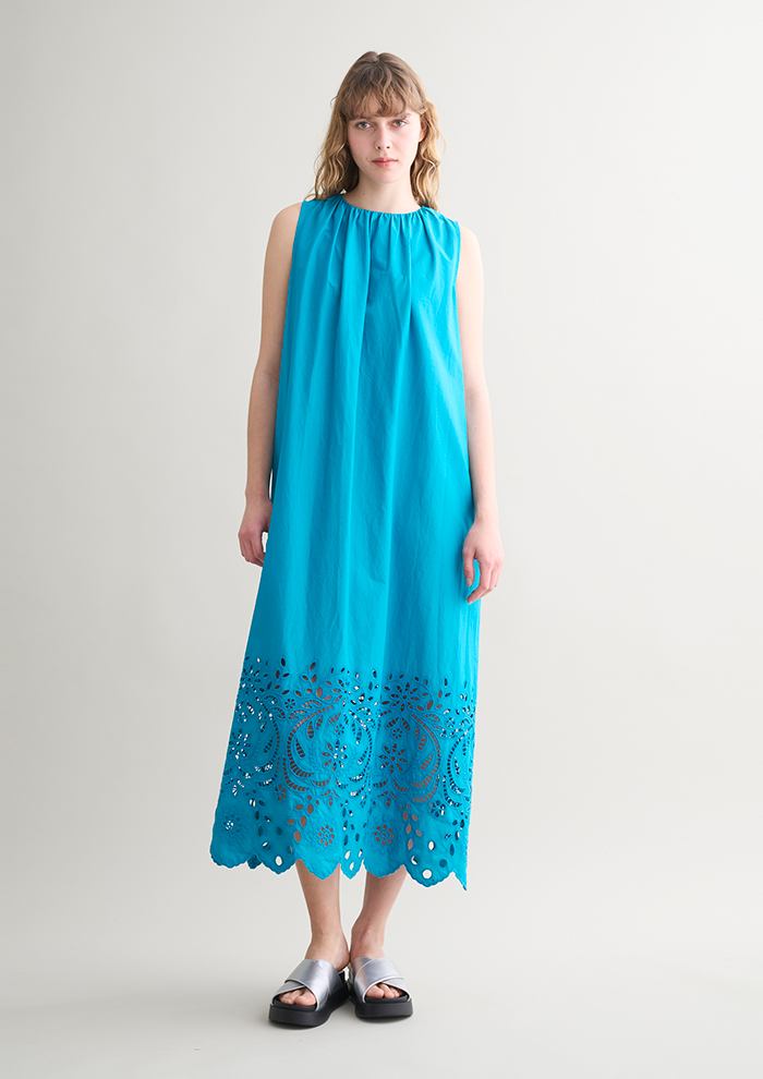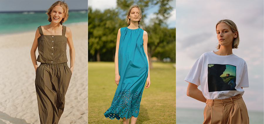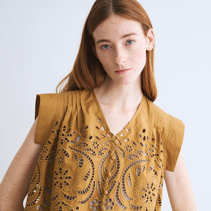 「今季のテーマである“旅”に最適なセットアップアイテムや、リゾートムード満載のドレスにもご注目を。カットワーク刺しゅうのドレスや同素材のトップスは存在感たっぷりの主役級アイテムです。ドレスは取り外しできるペチコート付きなので、レースの透け感が気になりません」。