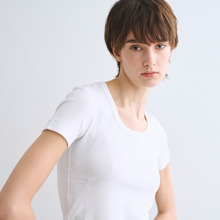 「「スリードッツ」を代表するネックライン“ジェシカ”は、2001年のデビューから現在まで一番人気のベストセラー。昨年の春夏は入荷しては完売が相次ぎ、スタッフでも購入できないほどでした。上がややすぼまったスクープネックとも呼ばれるUネックは、ヘルシーさの中に少しだけセンシュアルなニュアンスを秘めたライン。特別なパターンによるこの絶妙な開きが、デコルテを優美に、首をすっきりと長く見せてくれます。アクセサリーが映えるほどよい肌見せは、ジャケットやシャツのインにも最適。ボディ部分はベーシックアイテムに共通し、ウエストをなだらかに絞り、ショルダーは小さく華奢な印象に見せます。マニッシュなボトムとも好相性」。