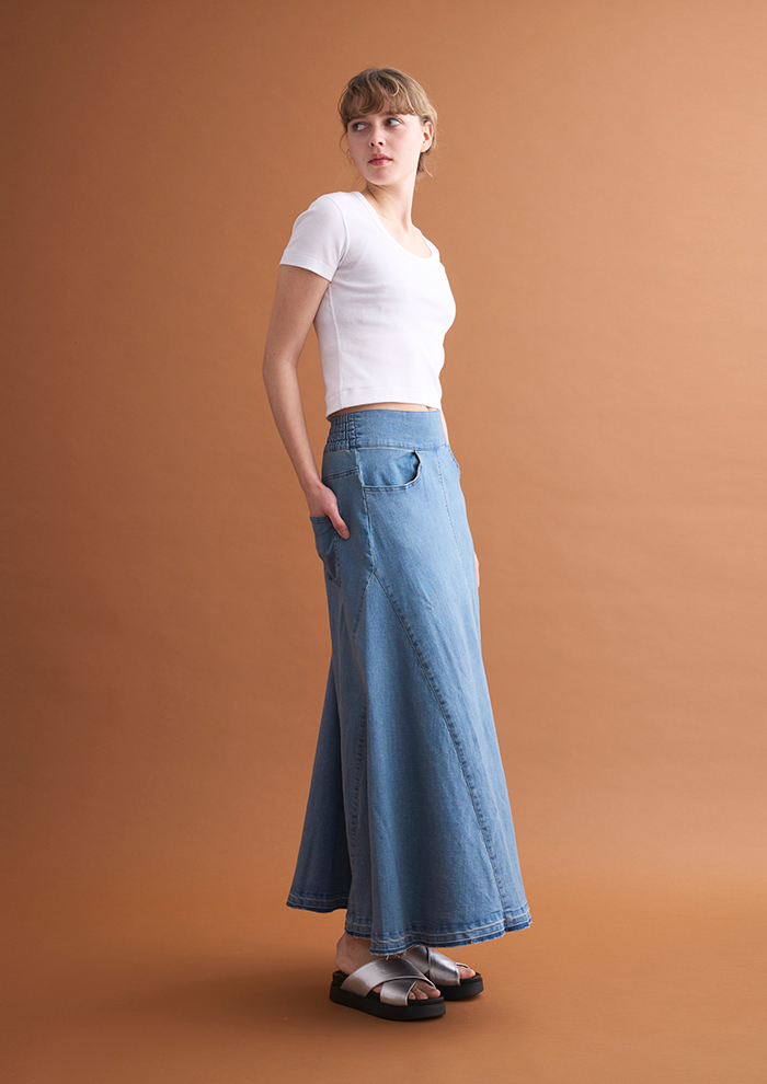 「今季は“ジェシカ”シリーズを拡大展開し、素材違いや同素材の新型も登場。特に注目は、ショート丈の“クロップドジェシカ”です。おへそのラインの絶妙な丈で、ハイウエストのボトムに相性抜群。トレンドのボリュームワイドパンツなどと合わせると一層グッドバランス」。