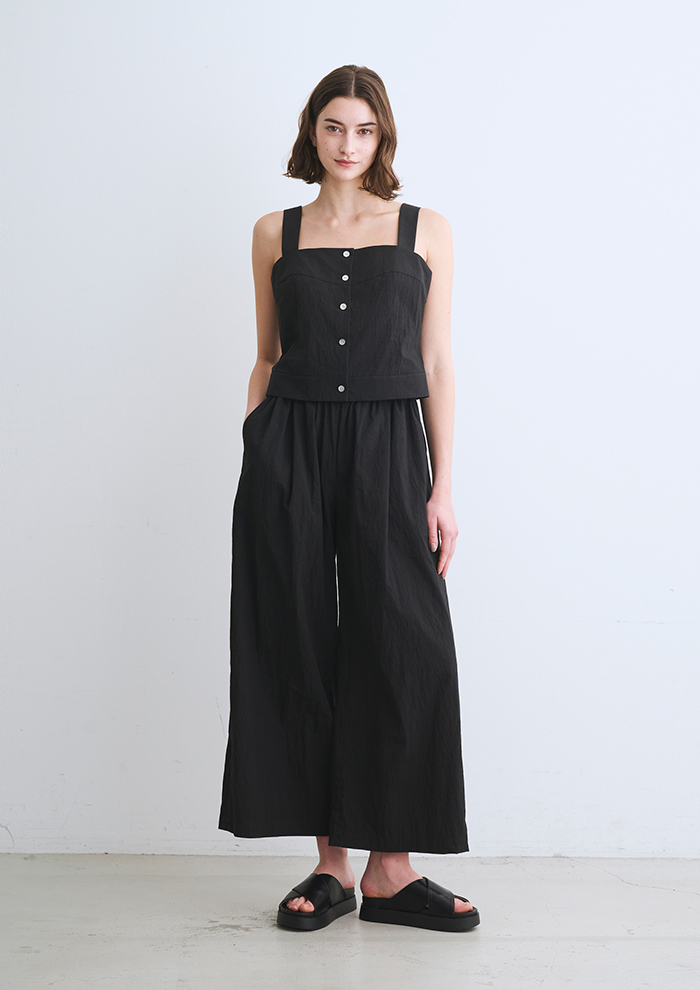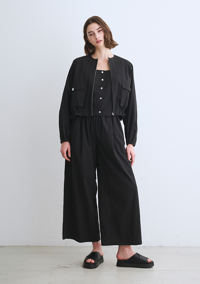 「ワッシャーと呼ばれるシワ加工を施したタイプライター素材。染色の後に天日干しすることでラフな質感を表現しています。トップス×パンツでオールインワン風に、同素材の羽織を合わせてスリーピース風に。色違いでコーディネートするのもおすすめ」。