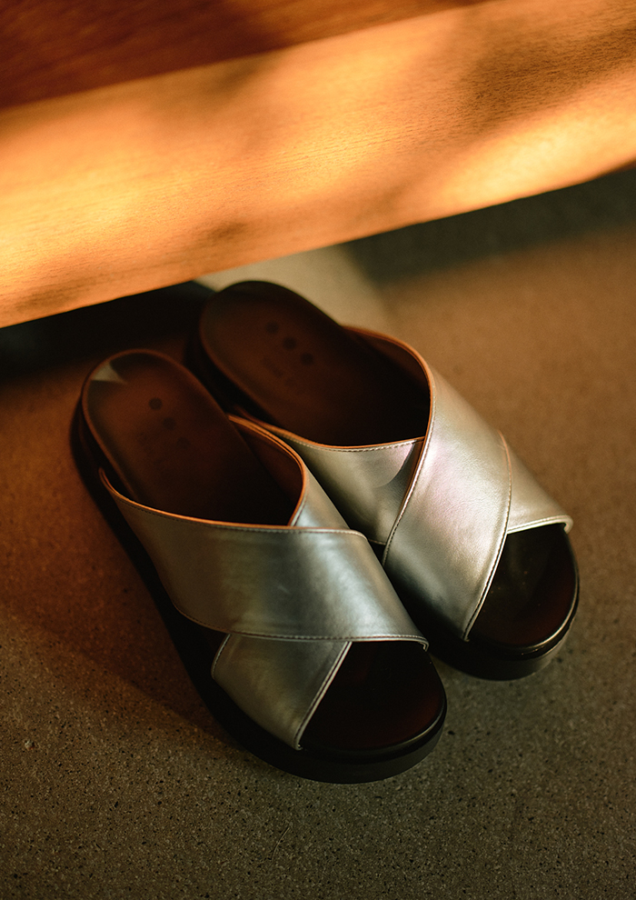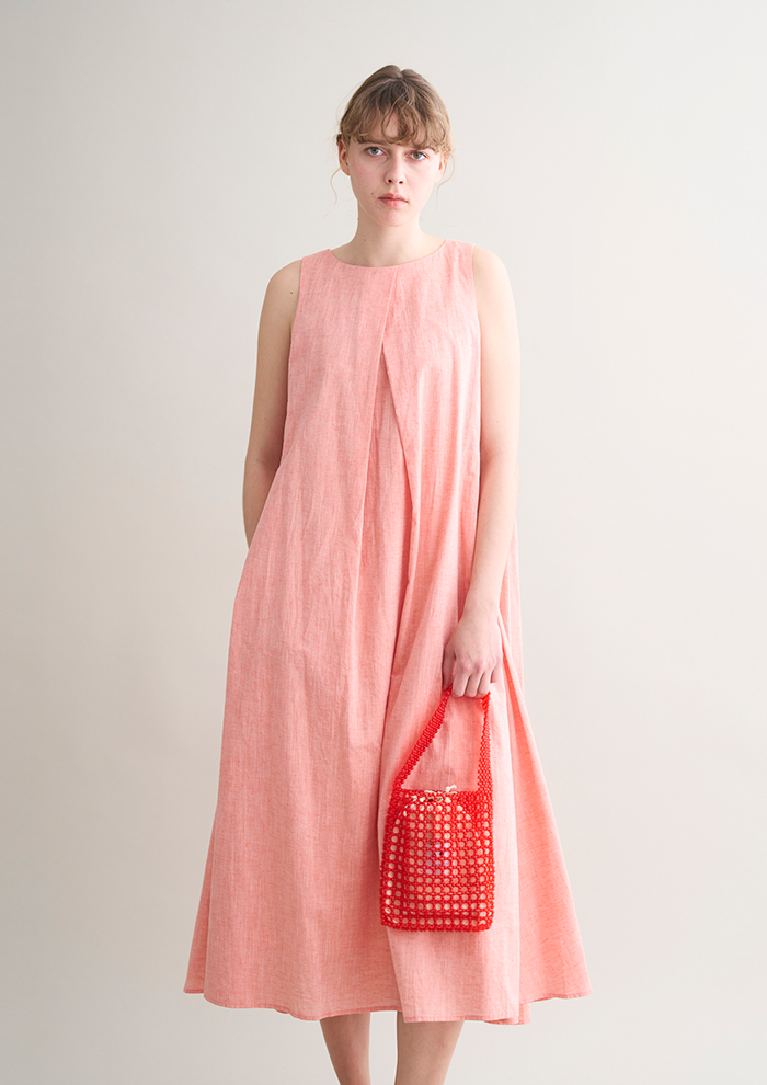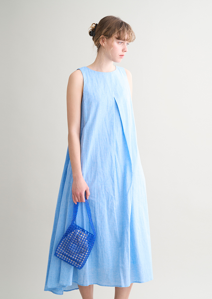 「こちらは、爽やかな着心地とカラーリングのコットンリネンドレス。タックで広がるライン、裾まわりのボリューム感が華やかです。リゾートで使えるサンダルも入荷しました」。