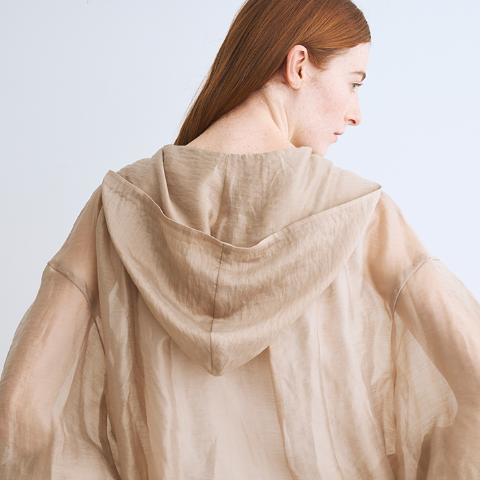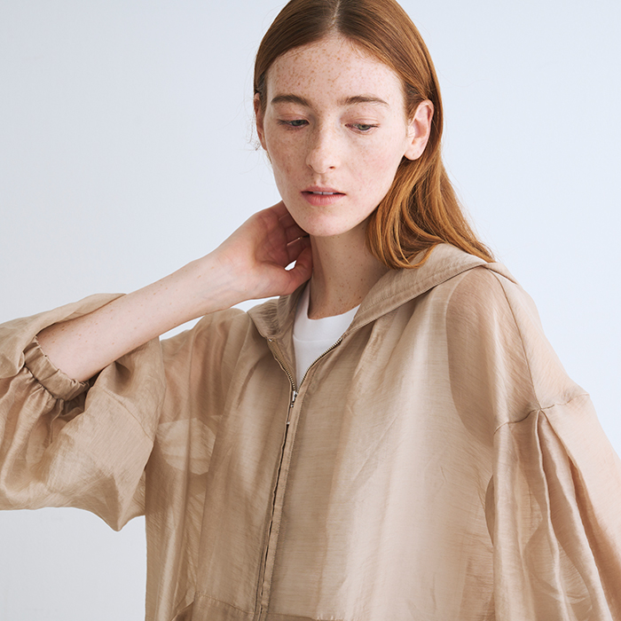 「ドレスアイテムの羽織には昨年大人気だったシアーフーディが再入荷。上品な透け感でやや光沢があるため、着るだけで雰囲気をまとえます。今年の人気カラーは新色のベージュ」。