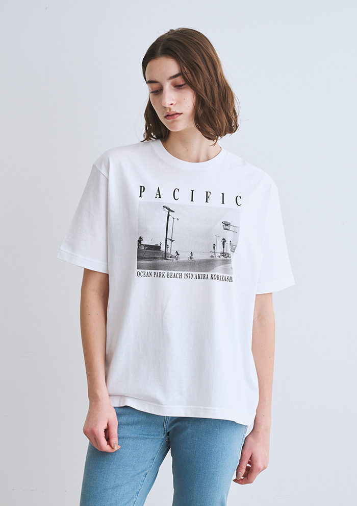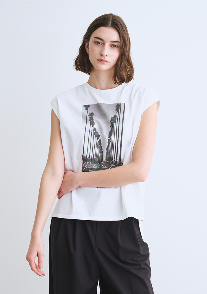 「「スリードッツ」のグラフィックTシャツといえば、毎シーズンのベストセラーAKIRA KOBAYASHIも見逃せません。70年代カリフォルニアの原風景を切り取ったモノクロのフォトが雰囲気たっぷりの着こなしを実現。今季は4柄展開で、ユニセックスのTシャツとタンクトップの2型を展開しています。今季のタンクトップはややショルダーにかかるフレンチスリーブ。ボディが泳ぐくらいの少しゆとりを持たせたデザインです」。