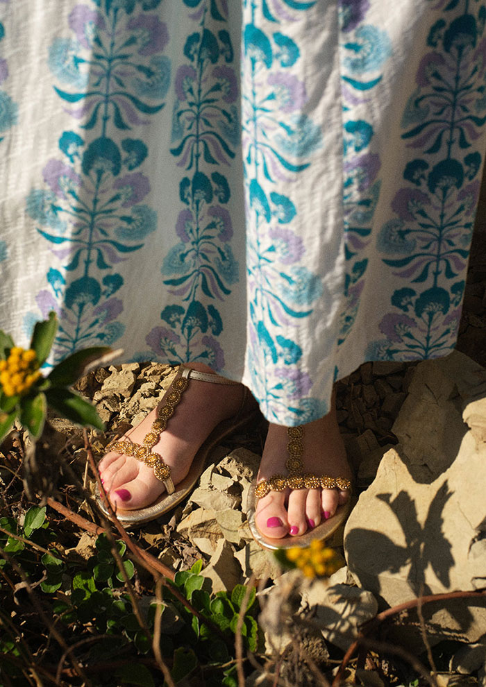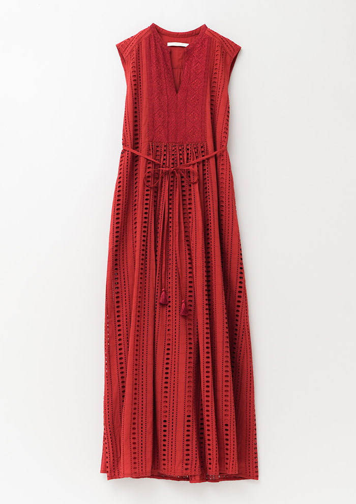 「こちらは、軽くて柔らかな肌触りのコットンボイルを使用したスリーブレスドレス。「ヌキテパ」のデザインチームがインドを訪れて目にしたあらゆる花モチーフにインスパイアされたシリーズです。胸下からギャザーで広がるフェミニンなシルエットは、上半身をコンパクトに見せ、スタイルアップも叶えます」。