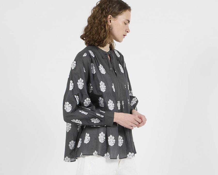 「肌心地の良いコットンボイルに手捺染(ハンドスクリーンプリント)で載せた、揺らぎのあるボタニカルモチーフが美しいブラウスとドレス。植物のアウトラインにゴールドやシルバーの箔を重ね、シャープなエッセンスをプラスしています。胸元を無地のシャーリングで切り替えることで、顔まわりに抑揚のある表情を生み、全身のバランスが縦長に見えるよう計算。柔らかいコットンボイルに包まれるような極上の着心地を、ぜひお楽しみください」。
