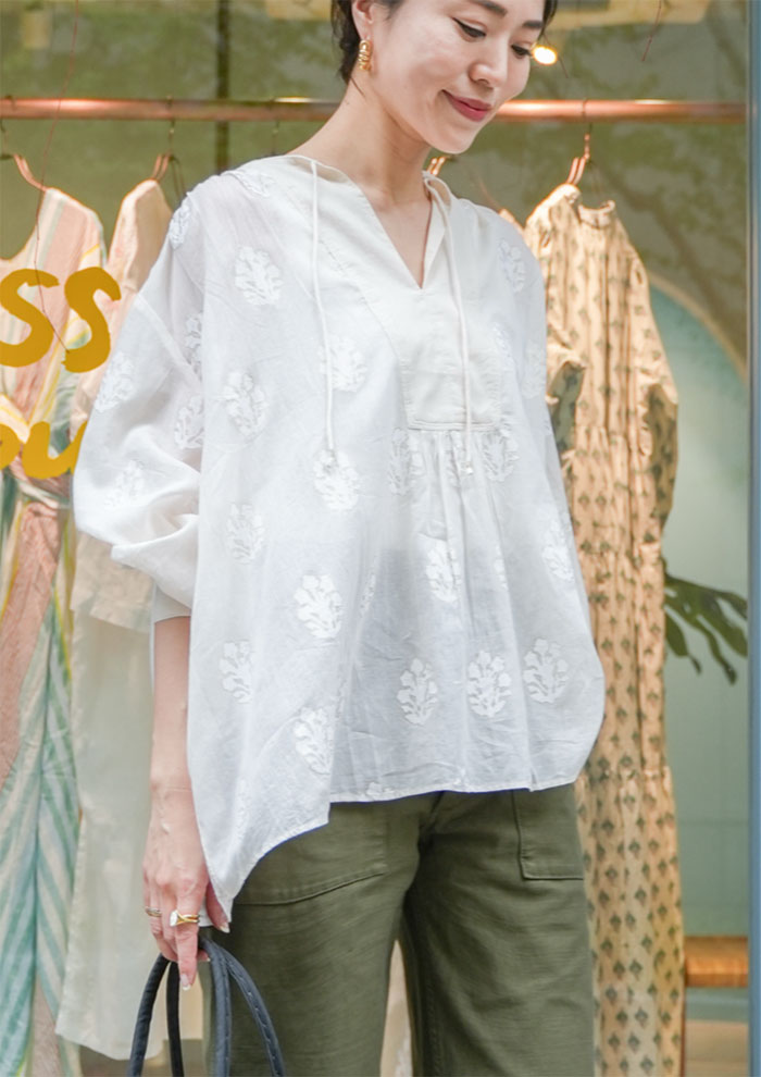 「上記ワンピースと同シリーズのブラウス。ナチュラルな素材感ながら、胸元のVカットやシアーな生地が女性らしい抜け感を演出します。背や袖口など、切り替えに施した繊細なギャザーが空気をふくみ、エアリーで柔らかなシルエットを実現。優しい表情のブラウスなので、あえてカーゴパンツやワイドパンツ、デニムといったマニッシュアイテムと組み合わせるのもおすすめです」。