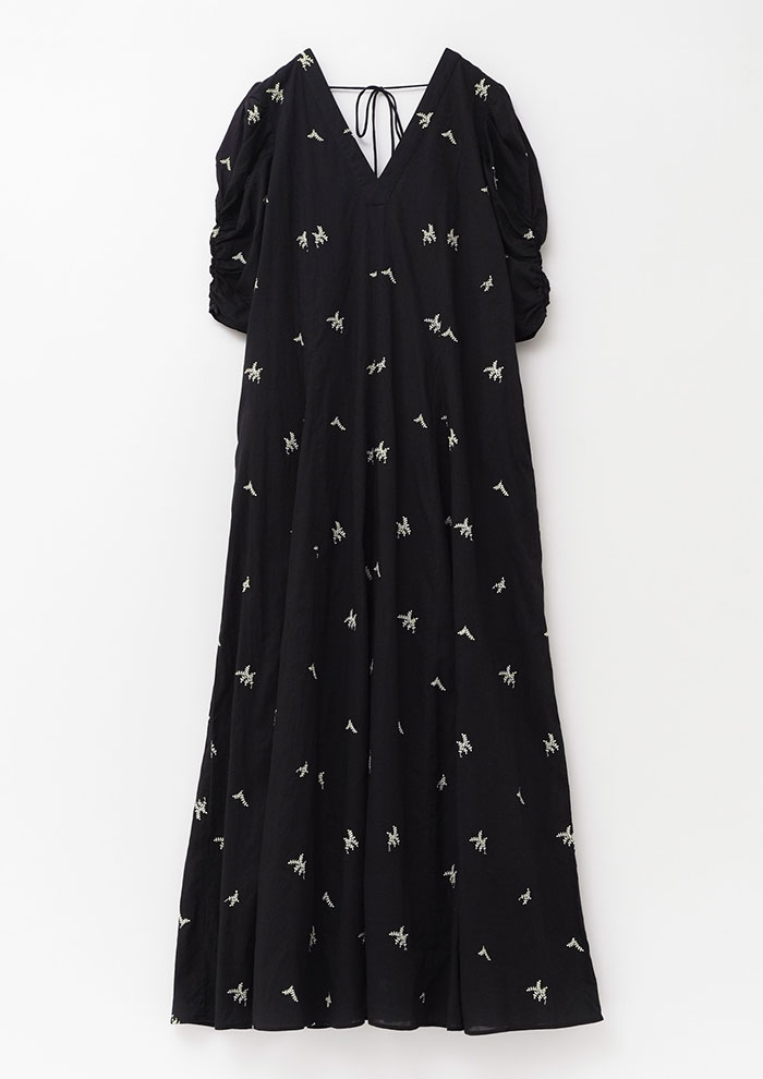 「細やかなギャザーとタックで形成したボリューム袖、シャープなリーフモチーフ刺しゅうとの甘辛バランスが魅力のロングワンピース。前後のVカットや、背で結うリボンコード、コットンボイルの柔らかさが女性らしい印象です。トップはコンパクト、ウエストの高い位置からパネル切り替えによってなめらかに広がるシルエットが、スタイルアップ効果も発揮」。