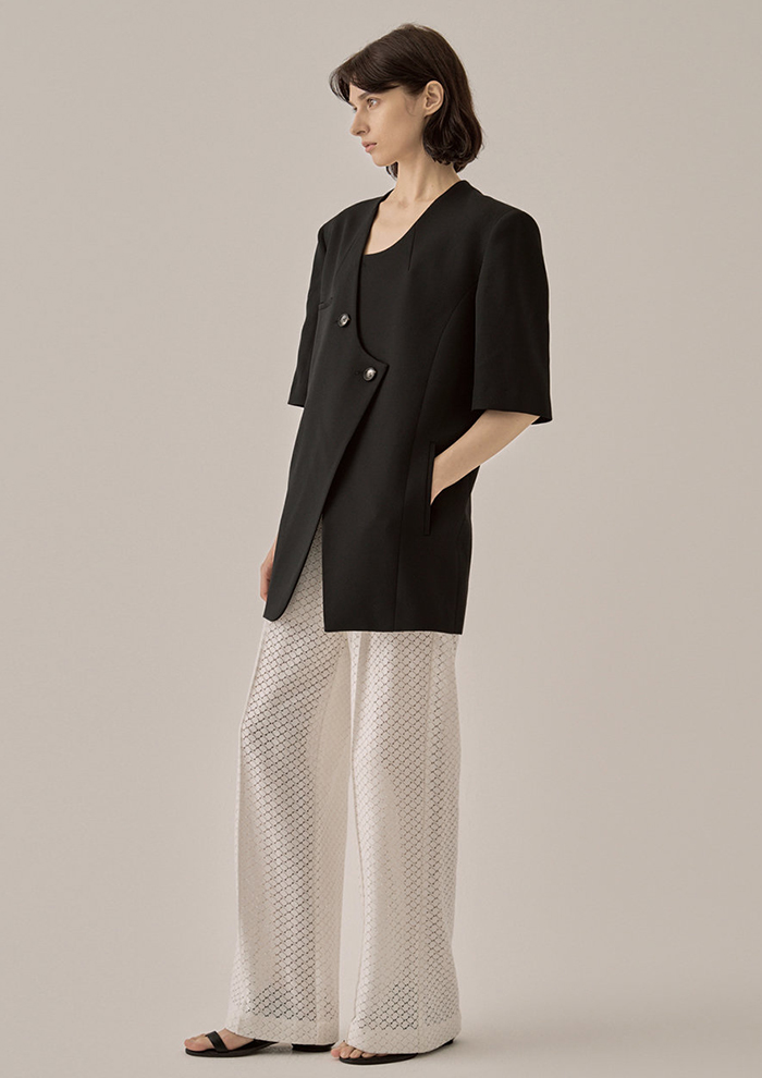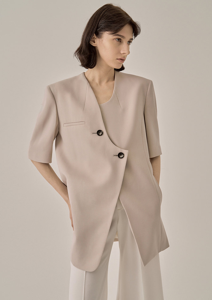 「アキラナカ」からは毎シーズン好調のハーフスリーブジャケットをご紹介。計算されたアシンメトリーデザインがモダンな表情を演出し、構築的なシルエットが自然とスタイルアップを叶えてくれる一着です。さらりと羽織るだけできれいめに仕上がるから、ちょっとしたフォーマルシーンやお仕事にも重宝。“きちんと感”は欲しいけれど、周りと差がつくスタイリングに仕上げたい──そんな時にこそ頼れるアイテムです。