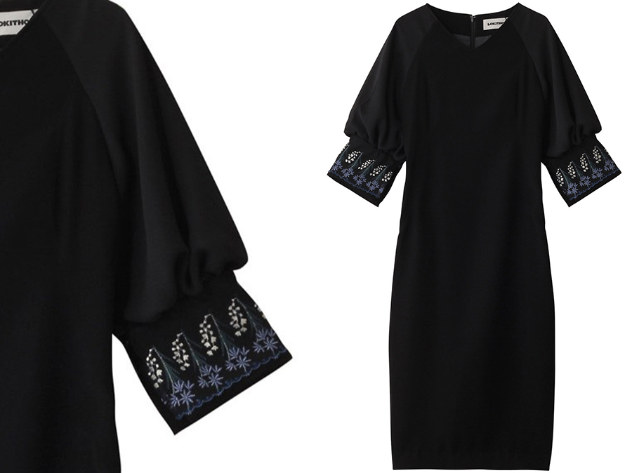 会食やプレゼンなど、ここぞという日に備えておきたいのが、程よく華やぎを添えるブラックドレス。デザイナーの手描きデッサンから生まれたフラワー刺しゅうが目を奪う「ロキト」の一着は、袖口にあしらわれた繊細なレースが、何気ない仕草までも優雅に演出。ややウエストを絞ったシルエットに、上品な光沢のある素材。さらに落ち着いたミディ丈が、大人の女性らしさを引き立ててくれます。
