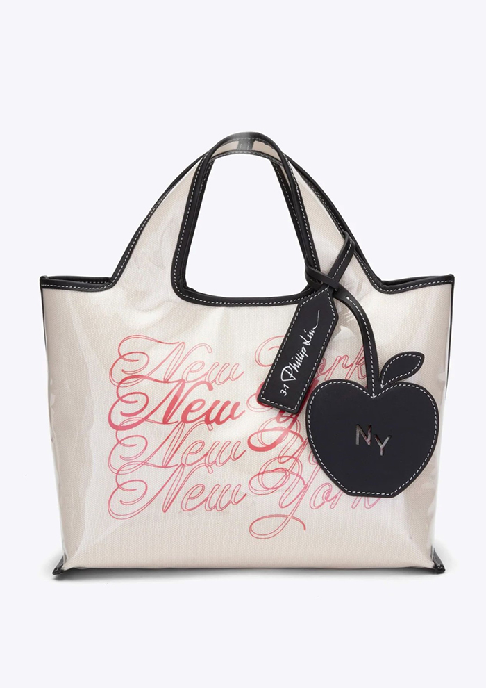 今シーズンらしいアイキャッチーなチャーム付きトート。PVCコーティングのコットンキャンバスに、ニューヨーク土産を思わせるプリントをオン。リンゴ型チャームにはシルバートーンのロゴプレートが光り、ブランドのホームタウンへの遊び心あふれるオマージュが感じられます。