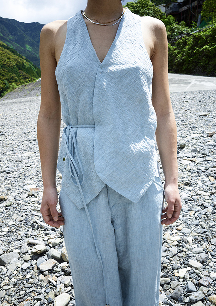 リネンの涼やかさに、モダールのやわらかな肌ざわりを掛け合わせた素材。真夏でも心地よく過ごせるジレとパンツのセットアップです。ほんのりくすみを含んだサックスブルーが、見た目にも清涼感をプラス。ラフな着こなしはもちろん、旅先でも活躍してくれる一着。大人の余裕が漂う、洗練された佇まいが魅力。