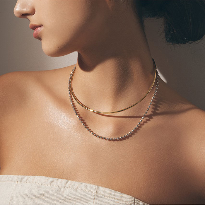 ジュエリートレンドの主流は、重ねづけ。なかでも、ゴールド×シルバーのバイカラースタイルが注目株。「プラス ヴァンドーム」から登場した【ELLE SHOP限定】バイカラーレイヤードネックレスは、驚くほど軽やかな着け心地が魅力。留め具のない仕様で、首にさっとはめるだけで今っぽいレイヤードが完成する、頼れる一本。