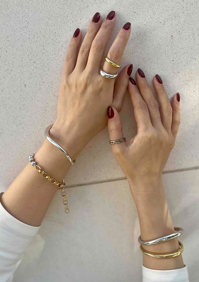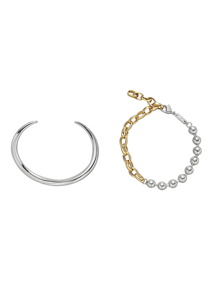 有機的なメタルカーブとボールチェーンのコンビネーションが楽しい、限定ブレスレットセット。人気の「BODY」シリーズのバングルやリングを重ねれば、ボリューム感のあるメタルの隙間から肌がのぞいて抜け感とヘルシーなムードが演出されます。