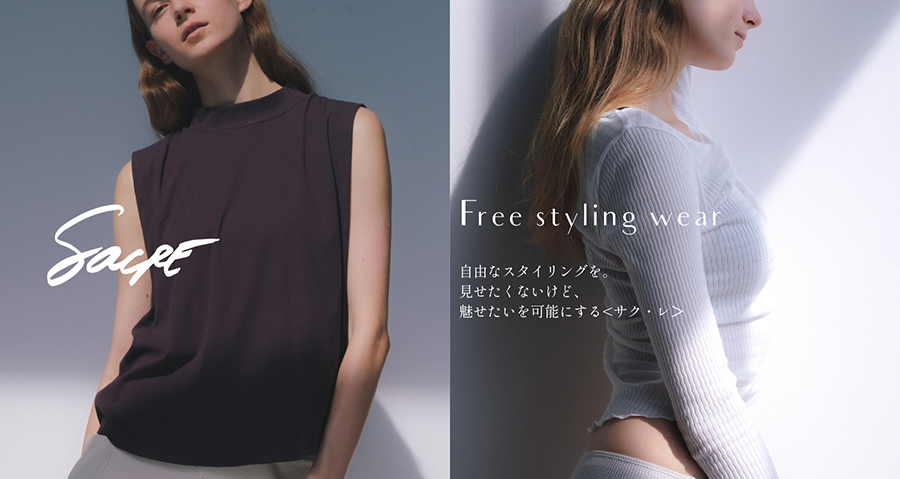 「希少なスイゼンジノリという藻から抽出される、神秘の潤い成分“サクラン”の唯一無二の保水パワーが肌を過酷な環境から守ります。今回は、「サク・レ」がチャレンジしたかった、インナーとアウターの境界をなくし、もっと自由に肌のことだけ考えて選べるアイテムを展開。肌への負担を極力おさえ、今までどおりのノンストレスさと極上の着心地で自分を解放しつつ、ファッションも楽しめるボディウェアです。魅せることも楽しむ、使えるデザインが自慢の商品をご紹介」。