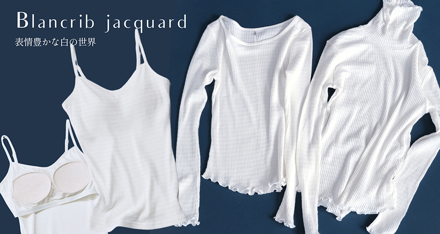 「フランス語で「白」を意味する“Blanc”。「サク・レ」がホワイトというカラーのためにつくったリブジャカードの素材です。真っ白な中に複雑な凹凸による光と影、その陰影がつくる表情が魅力のシリーズ。ミニマルなデザインは、清廉潔白な印象を際立たせます。やわらかい印象のルーズタートルや、カジュアルなクルーネックは、さまざまなコーディネイトに合わせやすい白に個性をプラスしていく存在。インナーのようなアウターのような、着る人次第で楽しめるアイテムです。素材をより魅力的に見せる縫製仕様も可憐さをプラス。「サク・レ」が提案する大人可愛い白です。レイヤーに合わせる長袖の他、人気のノンストレスなカップ付きキャミも登場」。