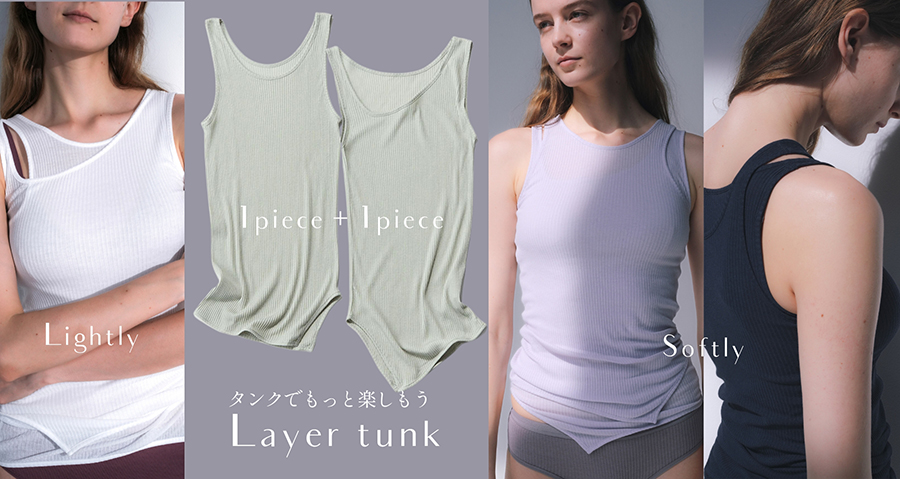「おすすめは、前後で着用可能な“2WAYタンク”。フリーカット+接着で縫い目がないため、肌への負担はゼロ。しかもまったく違う印象のクルーとVの表情にこだわりました。クルーはやや浅い襟元、バックは大きく開いたクールでモードな印象のV。Vを前にしてもアウターから覗かない実用性も兼ね備えています。カラーはインナーとしても使いやすいこだわりのベージュ、クールな着こなしに似合うパープル味のあるクリアなグレー、モードなブラウン、万能なブラックの4色。こちらには、はいていなかのような楽さが特徴のセットアップショーツもあります」。