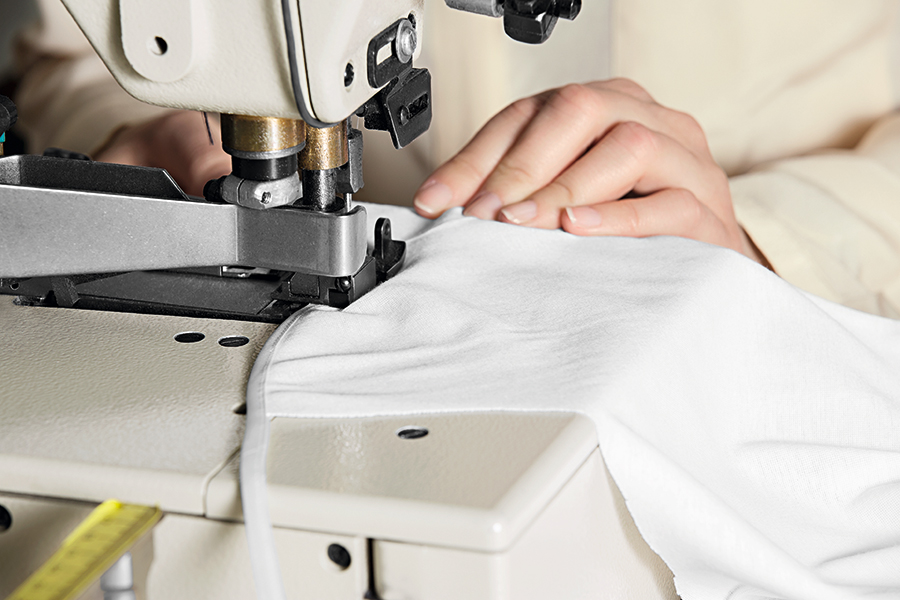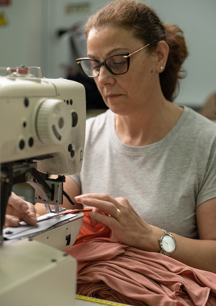 「130年以上もキャミソールなどのアンダーウェアを愚直につくり続けてきたノウハウが、世代をこえて愛される商品の実現につながっています。洗練された華奢な見た目にするために、ストラップや胸元のサテンテープを極力細い仕上がりに。この細いテープの端から数ミリのところを縫うことは非常に難しく、なかでも胸元のV部分の縫製は、「ハンロ」のキャミソールを長年つくり続ける職人だからこそなせる技術です」。
