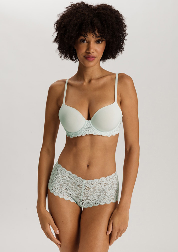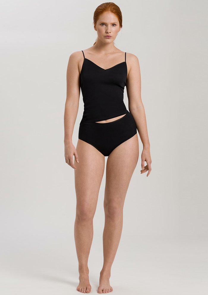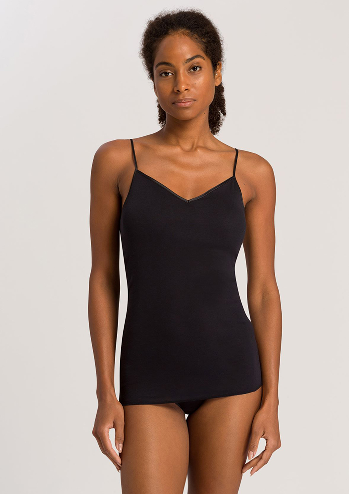 「1985年の発売以来、世界中で常にベストセラーの商品グループ。一番人気は、華奢なストラップと絶妙なVネックラインが美しいキャミソール。本国では“スパゲティトップ”と呼ばれ、歴代生産色数は145色以上、生産数は100万枚以上にもなります。“コットンシームレス”の歴史は1930年代にまでさかのぼります。1920年代、ココ・シャネルがドレスの下に「ハンロ」の伸縮性のある肌着を着用することをすすめたといわれ、1930年代には“コットンシームレス”の先駆けといえる、シンプルで快適なアンダーシャツのコレクションが登場しました。その後1985年に現在の形の、サテンの縁取りと美しいネックラインのキャミソールに」。