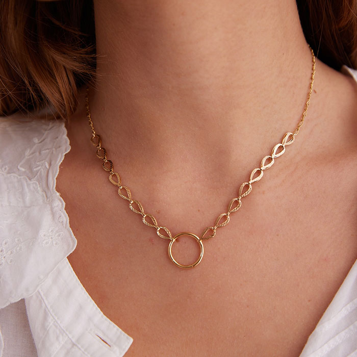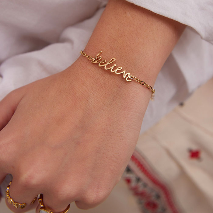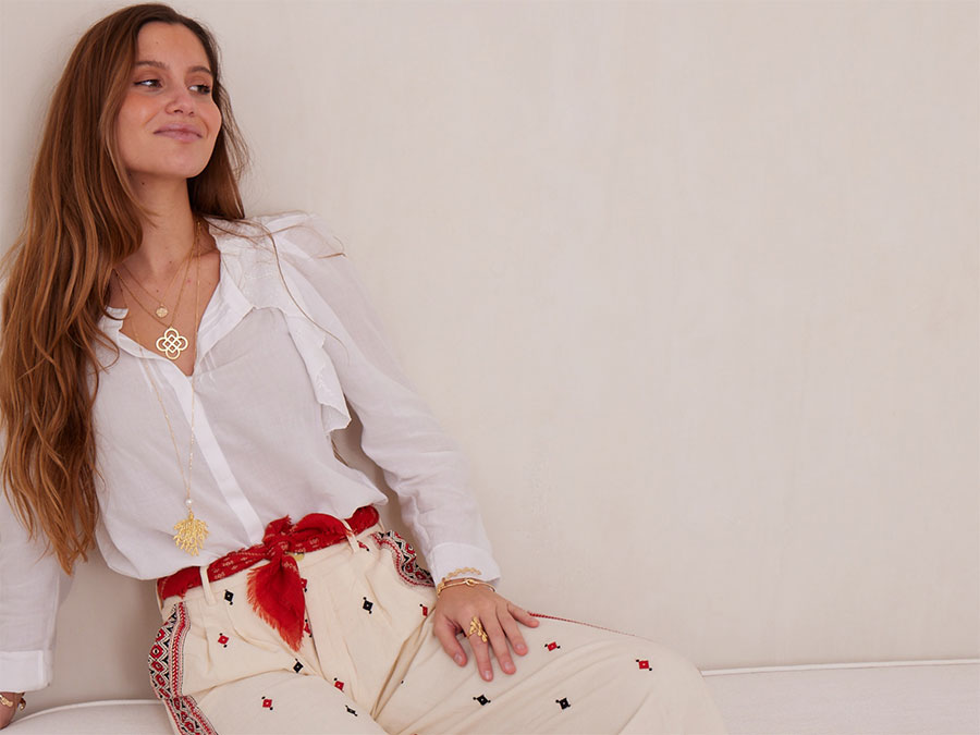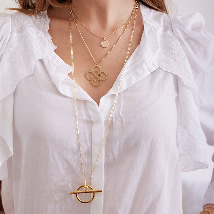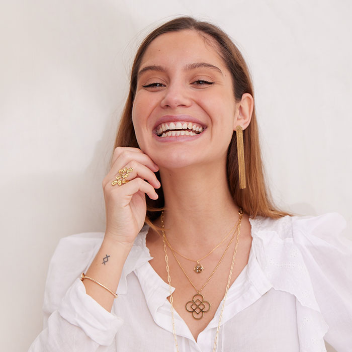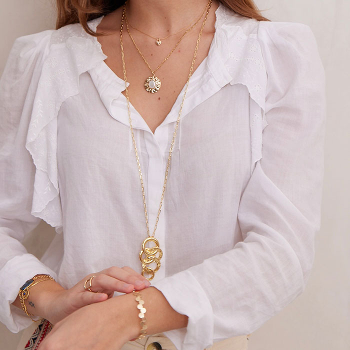 「リュクスでカジュアル感のある夏のバカンスコーデには、キャッチーで可愛らしいアイテムが大活躍。幾何学模様の“CYNTHIA”ネックレスは、控えめなゴールドの輝きが上品な雰囲気です。サークルモチーフの“Nelly”ロングネックレスは、シンプルさと洗練を兼ね備えたアイテム。「Believe(信じる・信頼する)」のメッセージを添えたブレスレットは、手書き風の繊細なデザインがスタイリッシュな印象です。ポジティブな気持ちになれるアイテムで、季節を思いきり楽しんで」。