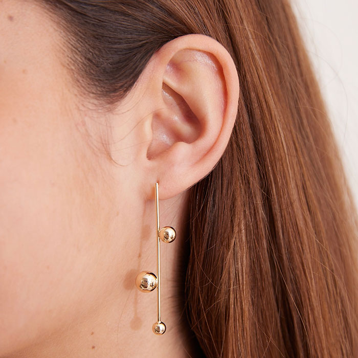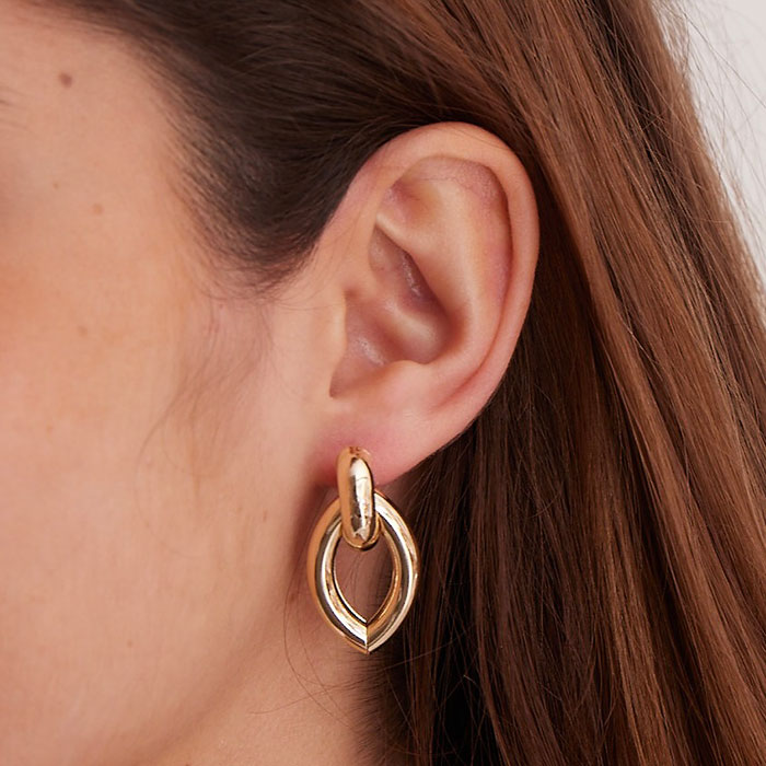 「春夏のアップヘアに合わせるなら、“BEGONIA”ピアス、“LOU”ピアスがおすすめ。スタイリッシュな“BEGONIA”ピアスは、顔まわりをシャープに引き立てて、エレガントな雰囲気を感じさせます。ゴールドのリーフモチーフが可愛らしい“LOU”ピアスは、縦長のシルエットがフェミニンすぎず大人な印象に」。
