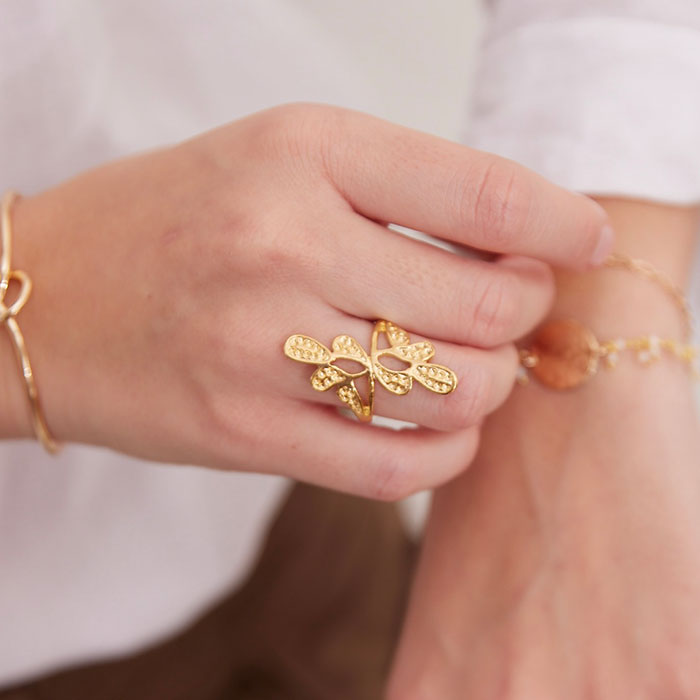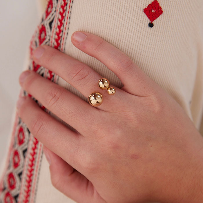 「今季のリングコレクションは、1点使いで手元をパッと華やかにするアイテムがいち押し!“BRANCHE”リングは、枝葉をモチーフにした繊細なデザインが特徴的。“3 BOULES”リングは、大小の異なる3つのゴールドボールが手元にアクセントを加えます。存在感のあるリングは華奢なデザインとの相性も抜群。ぜひ手持ちのリングとの重ねづけを楽しんでみて」。