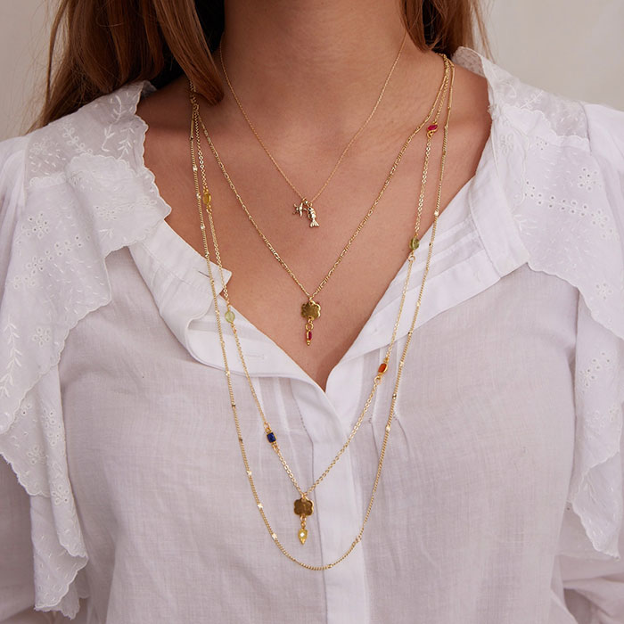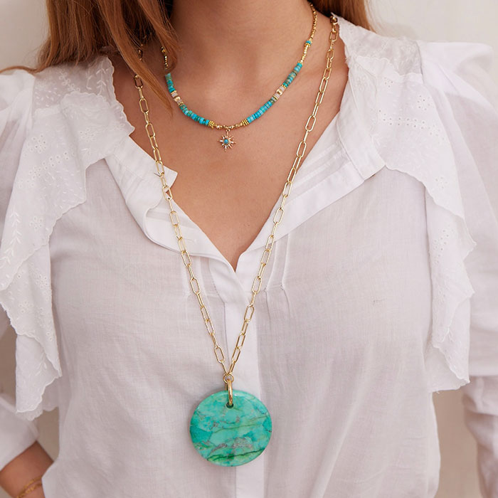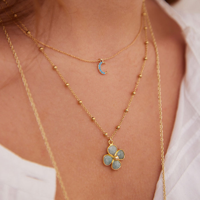 「ターコイズやアマゾナイトなどの涼しげなストーンジュエリーは、真夏のコーデにぴったり。存在感のある“TURQUOISE”ストーンロングネックレスは、シンプルなコーデを格上げしてくれます。三日月をモチーフにした“LUNE”ネックレスは、華奢なゴールドチェーンが女性らしい雰囲気。花モチーフの“MARGUERITE AMAZONITE”ネックレスは、首元に華やかさをプラスするデザインです。手持ちのネックレスと重ねづけして、夏のレイヤードスタイルを楽しんで」。