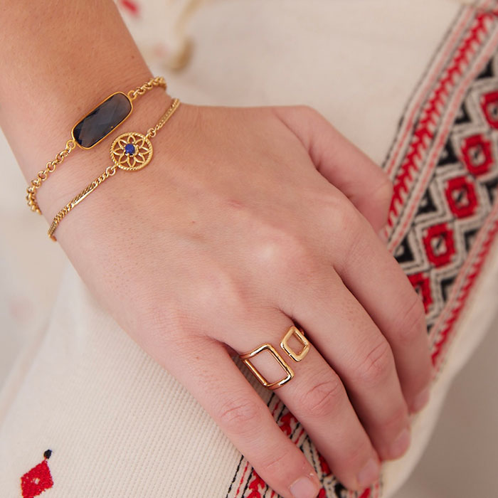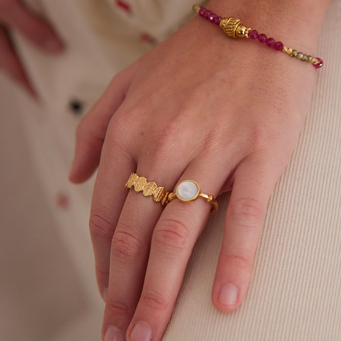 「春夏らしいコーデを楽しみたいなら、ぜひマルチカラーを取り入れてみて。“3RANGS”ロングストーンネックレスは、1点でレイヤースタイルを満喫できる優れもの。ぜいたくな三連チェーンに色鮮やかなストーンがきらめき、首まわりを華やかに演出してくれます。“CLOU”リングは、天然のシェルモチーフが目を引く優美なデザイン。“CARRE”リングはスクエアをモチーフにしたシンプルなデザインで、ミニマルながらも手元に華やかさをプラスします。深みのあるブルーが印象的な“MARINE”ブレスレット、“FRANCINE”ブレスレットは、上品なきらめきが夏らしいスタイリングにぴったり」。