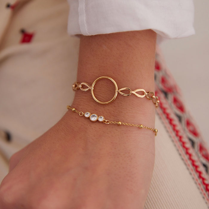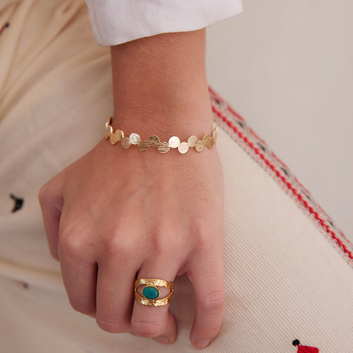 「春夏のオケージョンシーンで活躍するアイテムをお探しなら、どのコーデにも寄り添えるゴールドアイテムがおすすめ。“GRACE”ネックレスはハンマード仕上げのゴールドフレームと、中央にセットしたパールが上品にきらめく、エレガントな名品。“FIDJI”ロングネックレスは、ゴールドのサークルモチーフが繊細なチェーンに揺れて視線を引きつけます。円形のモチーフが連なる“JONC CRESUS”バングルは、マットな質感のゴールドが高級感を演出。肌見せするシーンが増える季節だからこそ、ゴールドアイテムで華やかさをプラスするのが◎」。