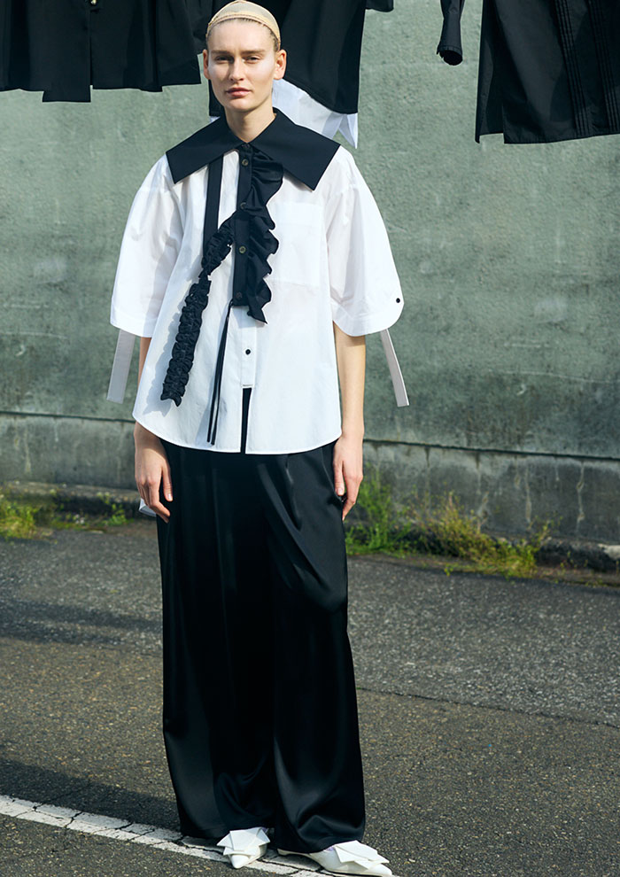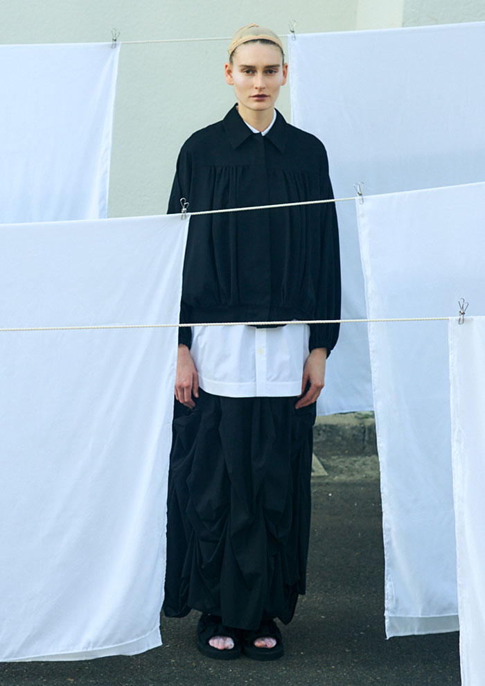 「まずは、ギャザーの縦ラインが美しいカーブヘムのビッグシルエットブルゾンから。カジュアルなブルゾンながら襟付きデザインにすることで、上品に着こなせる一着に。ワイドな袖は涼しく着用できるうえ、シルエットに個性をプラス。同素材のアイテムとのレイヤード、セットアップスタイルがおすすめです。ルックでは、サークルシルエットがユニークなフレンチスリーブシャツをスタイリング。バックにドレープが溜まるパターンと反発感のある素材が、こなれた動きを演出します。ボトムにはラウンドパターンとタックを巧みにあしらった、独特なドレープ感のスカートを。華やかなデザインを透け感のある素材で仕上げ、軽やかな印象に仕上げています。同素材のセーラーカラーボリュームブルゾンとのセットアップはもちろん、Tシャツなどでメリハリをつけるのも◎」。