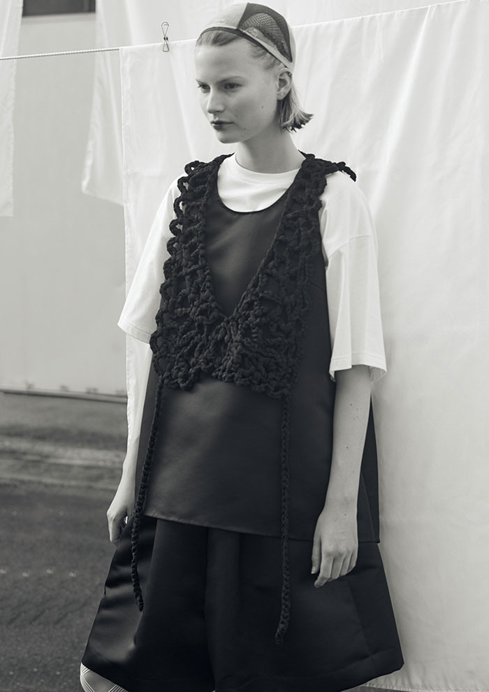 「夏に活躍するタンクトップをミニマルなシルエットにし、大人の女性をエレガントに見せる一枚に。PEツイルやPEライトジョーゼットのボトムとも好相性です。ルックでは、セットアップ着用できるキュロットパンツをコーディネート。ウエストから入ったタックとギャザーでボリュームを出したフェミニンなデザインです。きれい目な素材感は大人の女性でも品よくはけて、ショート丈が抜け感を演出。これひとつでこなれたスタイルが完成!」