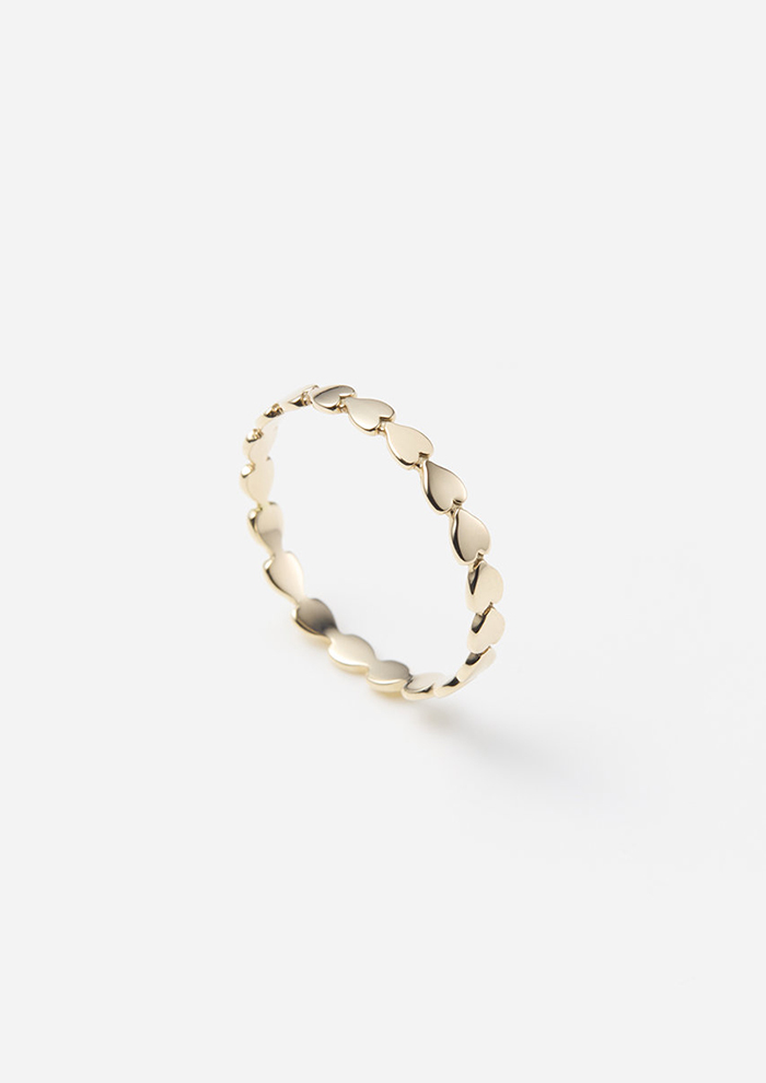 「連なったハートが大人の軽やかさと遊び心をくすぐるリング。1本でも、重ねづけしても、その日の気分やスタイルに合わせて自由に楽しめます」。