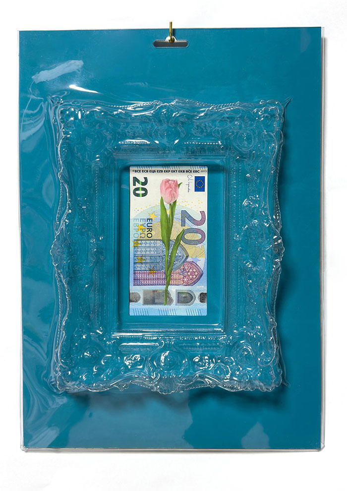 「この作品は、切花が人の手によってその存在を生産・管理、所有され、自らは何を成すこともなく花瓶の中で枯れ果てて行くまでの様子を、紙幣に花を描くことで表現しています。同じような構造は花瓶の中だけではなく、社会のいたるところに存在しており、私たちは時に無自覚に、悪意を抱く事もなくそれらに加担し、何らかの存在を消費しながら生きてるのではないでしょうか。本作は歴史の記録上、最古の投機バブル「チューリップ・バブル」をモチーフに選び、制作を行いました」。(みょうじさん)