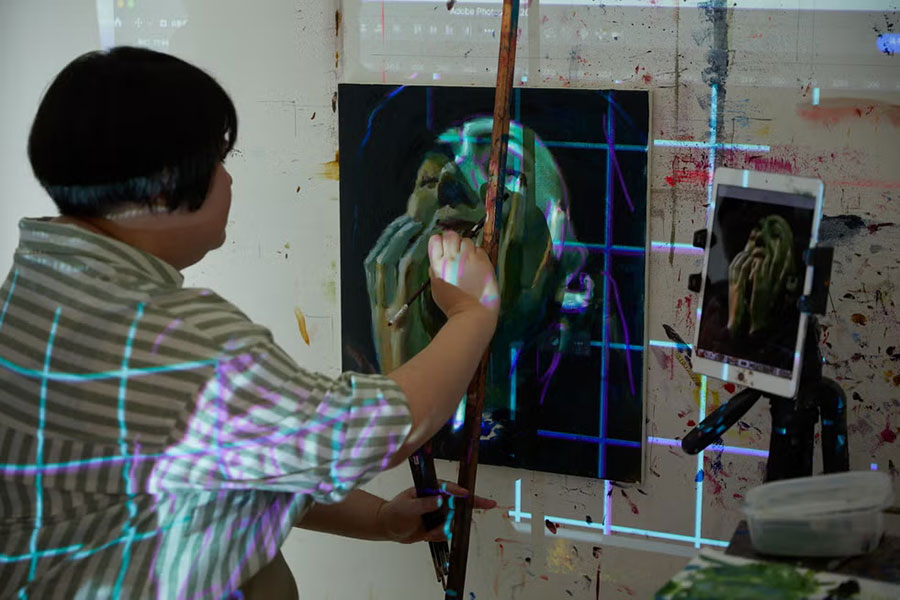 “計算され尽くした色・光・構図の操作が生む、ほとばしる臨場感”。『キャバレー』や『コーラスライン』など、舞台の熱気がそのまま伝わってきそうな絵を描いているのが上野英里さん。ホワイトキューブのアトリエでは、プロジェクターに映した画像を写生するように筆を動かす上野さん。