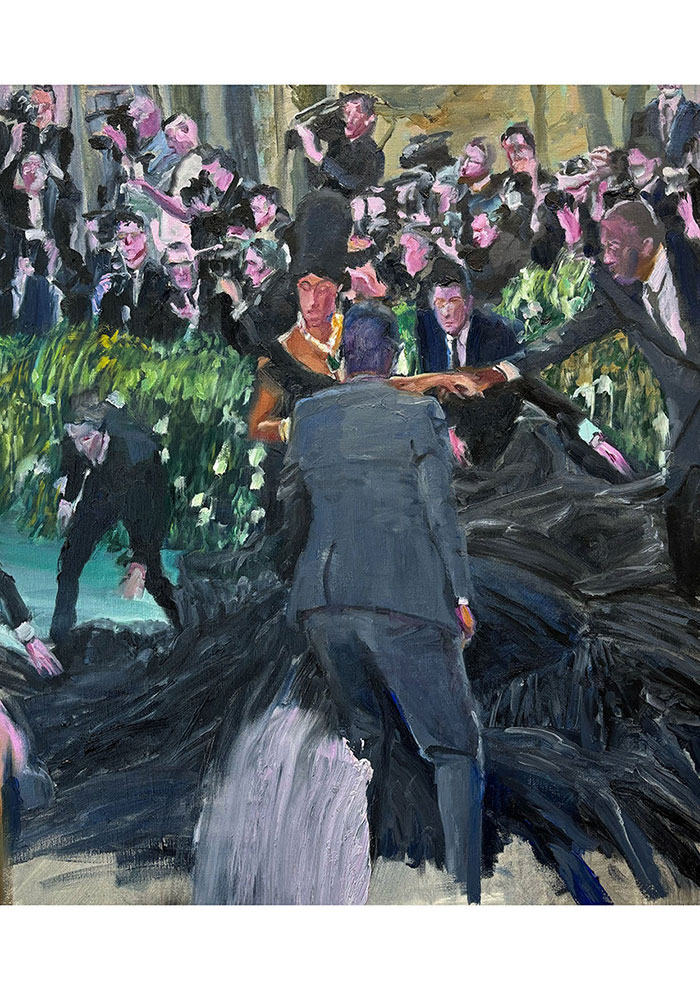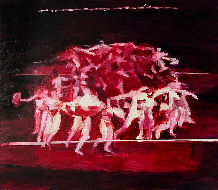 一番大きな作品を含め、フェス中にも何点か売れてしまったのですが、私のおすすめは躍動感とパッションを感じられるこちら。「組み合わせた腕がジグザグの線を描くようにし、色数も抑えてサイ・トゥオンブリーの抽象画の考え方に近い感覚で構成しています。ここは描く、ここは抜いて光だけを追う、というように人間の存在を筆跡に分解していく感覚は、私独特のものかもしれません」(上野さん)。日本の住宅にも飾りやすいサイズも◎。
