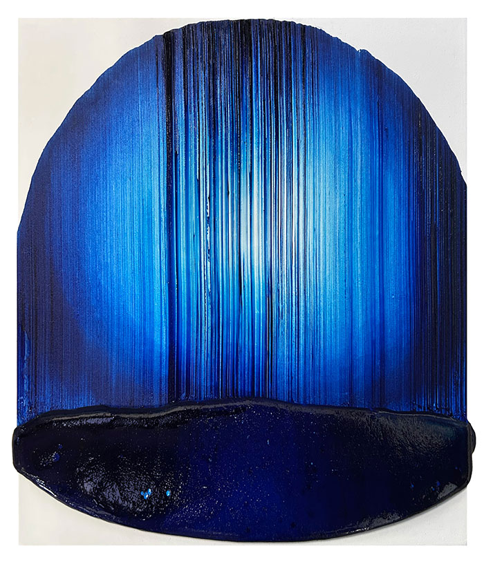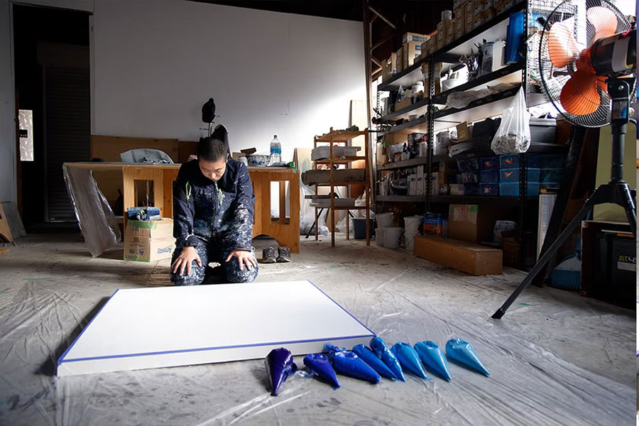 “日本独自の抽象性を模索し、自分でコントロールできないものを作る”。大学院の修了展で一気にアート界を驚かせ、そのまま台湾や韓国をはじめアジア全域でコレクターを魅了し続けている香月美菜さん。描くのは常に青だけで力強く描かれたミニマルな世界。「絵の具」そのものを見せることをテーマに、ひと筆描きで作品を生み出す。それは禅を思わせる東洋的な世界でもあります。