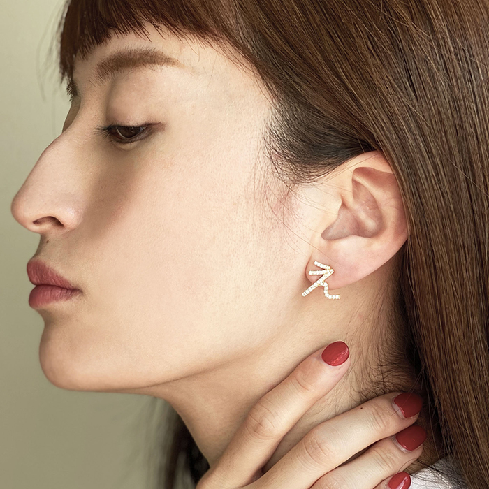 「こんなデザイン無かった! 「ビジュードエム」のアイコンジュエリーのひとつともいえる“ひらがなピアス”。発売以来ベストセラーのアイテムです。どの文字も丸みのあるフォントがかわいい存在感。1つでインパクトがありますが、2つ3つ並べて名前や言葉にして身につけるのも楽しい、リュクスな遊び心あふれるジュエリーです」。