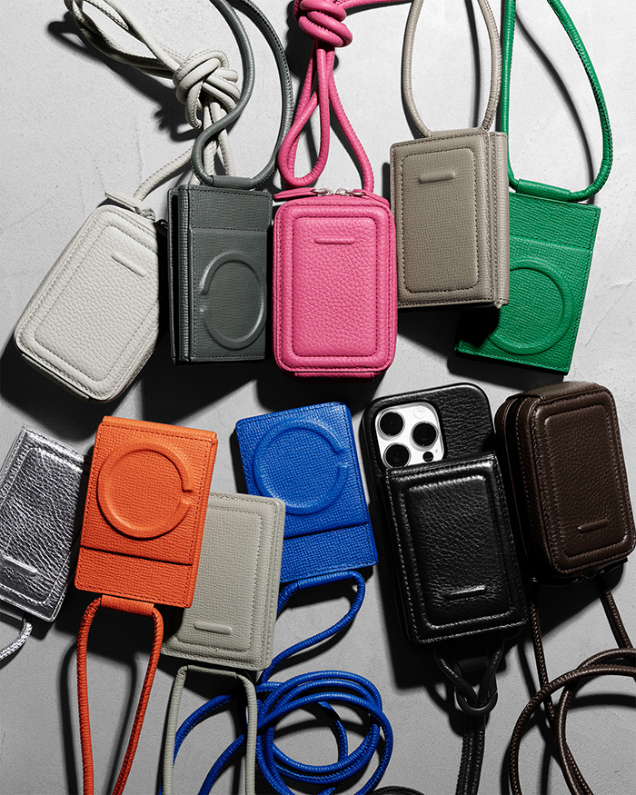 「こちらは“カラビナ付きiPhoneケース”に“レザーストラップ付きiPhoneアクセサリー”(全3種)を組み合わせ、iPhone本体に財布やポーチなどの利便性を拡張させたスマホショルダー。今回の新色は、鮮やかな発色と上質な風合い、傷や色落ちに強い堅牢性を兼ね備えた上質なレザーを採用しています。ミニマルな装いにもよくなじむアクセントカラーは、スタイリングを一気に華やかな雰囲気に」。