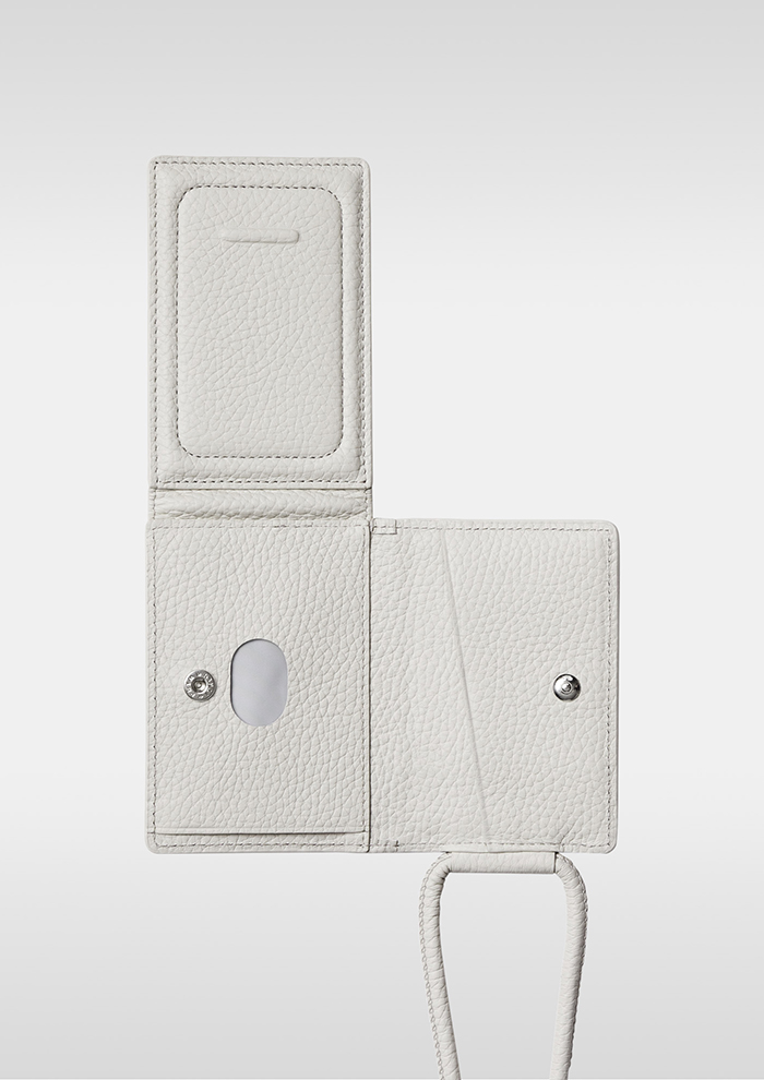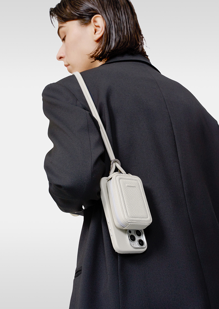 「iPhoneアクセサリーの“マイクロバッグ”は、普段ポケットに入れるような少し厚みのある小物類や身分証、クレジットカードをひとつにまとめられるポーチ。AirPods、鍵、リップ、目薬、ミントタブレットetc.がすっきりと収納できます。“カラビナ付きiPhoneケース”と組み合わせることで、ランチや休憩のカフェ、出張先の食事など、ちょっとした外出をスマートに演出します」。