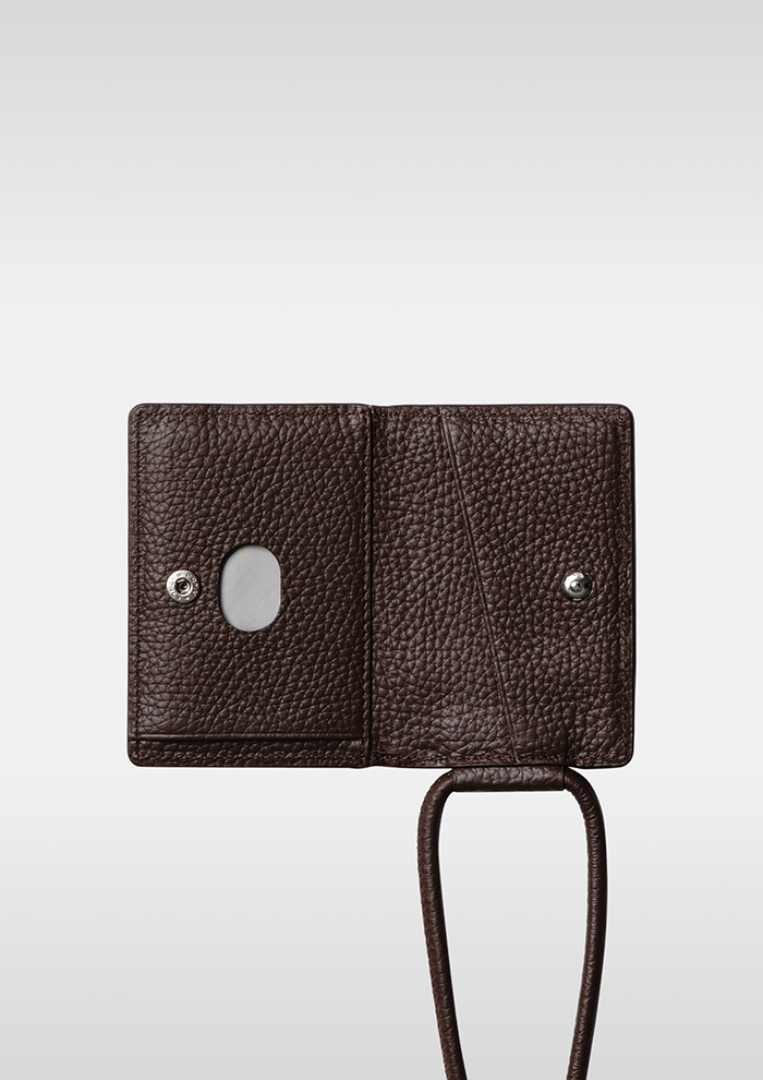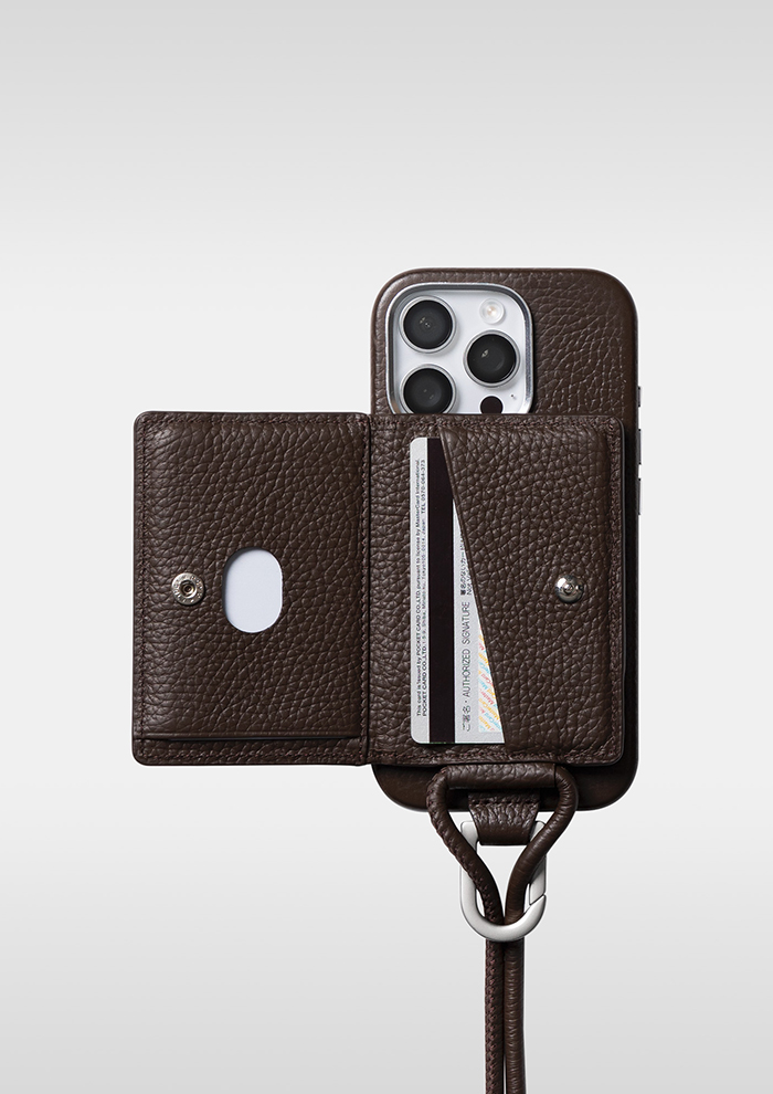「iPhoneアクセサリーの“ウォレット”は、縦、そして横に二重に開閉し、カード2~3枚、三つ折りの紙幣5枚、硬貨10枚を収納できるほか、コインポケットにはAirTagも収納可能です。“カラビナ付きiPhoneケース”と組み合わせることで最低限のキャッシュを携帯できるため、現金しか使えないタイミングにも安心です」。