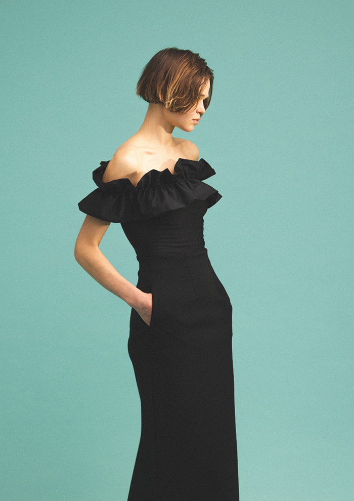 「まず1つ目は、モード感があり、大人のトレンドスタイルを演出できるワンピース水着。ナイロンタフタを使用したフリルは立体的で華やかな雰囲気を演出します。最後まで調整して完成したボリューム感がこだわり。フリルは取り外し可能なので、ミニマムな一着としても楽しめます。私はワンピース水着が大好きなので、2パターン楽しめるのがうれしいです! 気になる体のラインは、バランスよく入れたギャザーがほどよくカバー。高めのレッグラインは脚長効果もあります。ロングボトムと合わせたら、カジュアルディナーにも◎」。