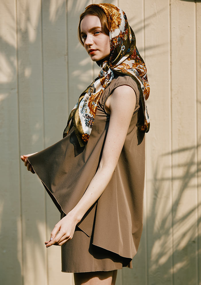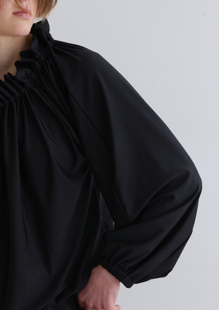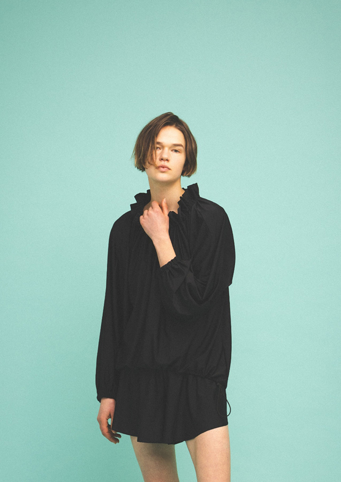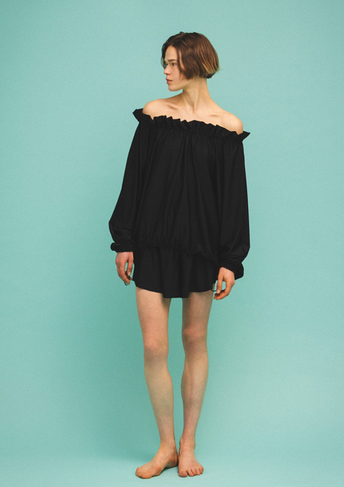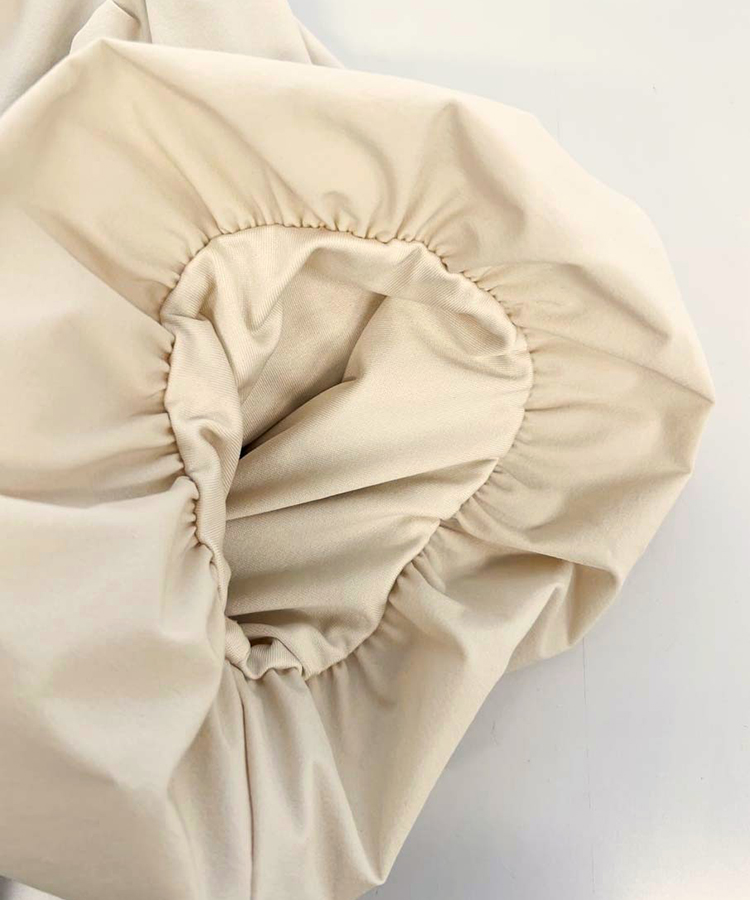 「2つ目は、ナイロンタフタを使用したパフスリーブビキニ。袖のシルエットやボリューム感にこだわった一着です。こちらも袖は取り外し可能で、ベーシックかつミニマムな雰囲気も楽しめます。大人の上品な肌見せが楽しめるバランスもポイント。高めのレッグラインは脚長効果が抜群です。シンプルなので、シアートップスのインナーにもぴったり」。