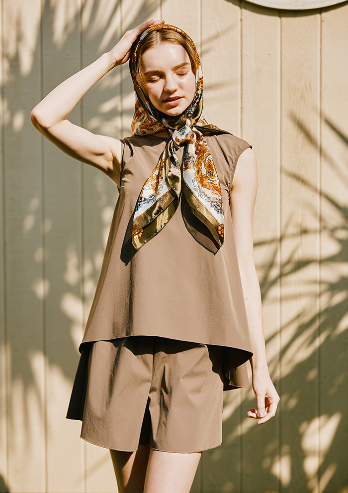 「こちらは、モード感のある立体的なシルエットがポイントのタンクトップデザイン。デイリーになじむマットでほどよいハリのあるナイロン素材は、日焼け対策ができる一番基準の高いUPF50+の機能付きです。二重構造のトップスは内側をボトムにインして着用できるので、お腹や背中が出ること無く、快適な着心地! ブラ内側はカップがずれにくい工夫もしています。セットのショートパンツは太ももをすっきりと見せてくれる上品なフレアシルエット。ウエストの紐は前後1周入っており、フィット感の調整が可能です。これひとつでコーディネートがきまる3点セットは、イージーケアなのも◎。きれい目カジュアルな雰囲気は、ワイドパンツ合わせでも可愛いですよ!」