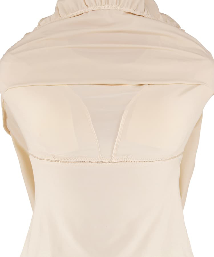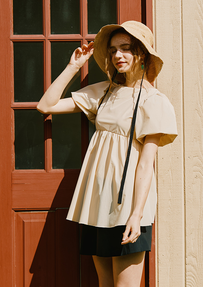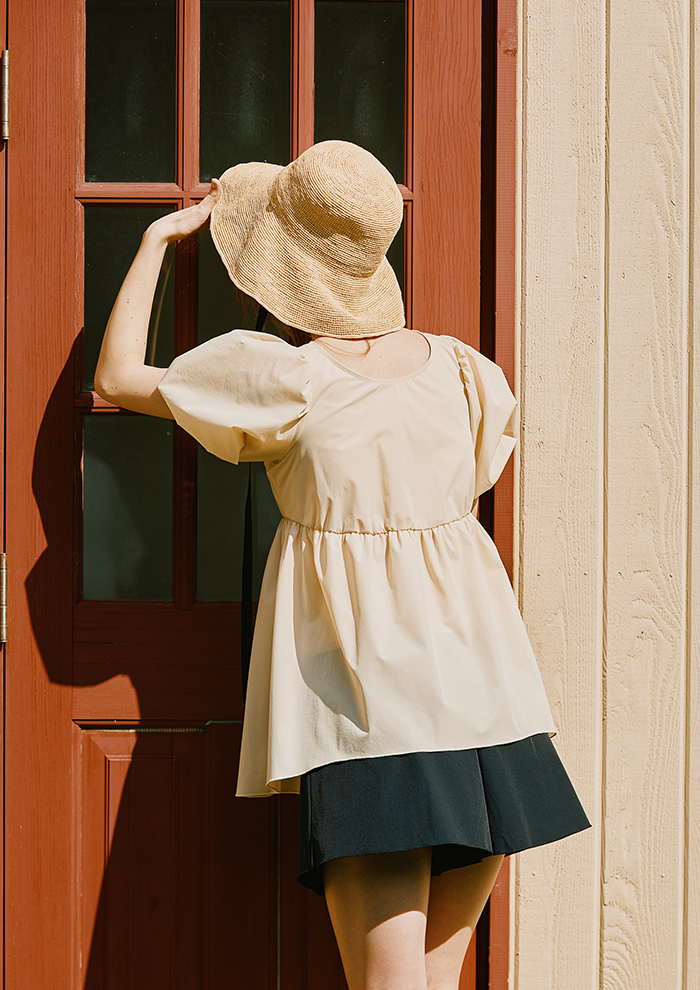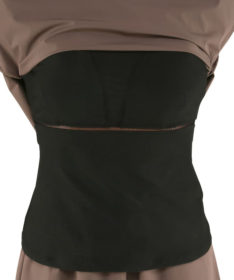「甘さをおさえた大人フェミニンなバランスにこだわったパフスリーブデザイン。立体的なパフスリーブは二の腕を、リラックス感のあるシルエットはボディラインをおしゃれにカバーしてくれます。袖部分は二重構造なので締めつけもなく快適。こちらも、日焼け対策ができる一番基準の高いUPF50+の機能付き素材です。二重構造のトップスは内側をボトムにインして着用できるので、お腹や背中が出ること無く快適。ブラ内側はカップがずれにくい工夫もしています。大人フェミニンな雰囲気は、デニムと合わせてピクニックなどにも!」